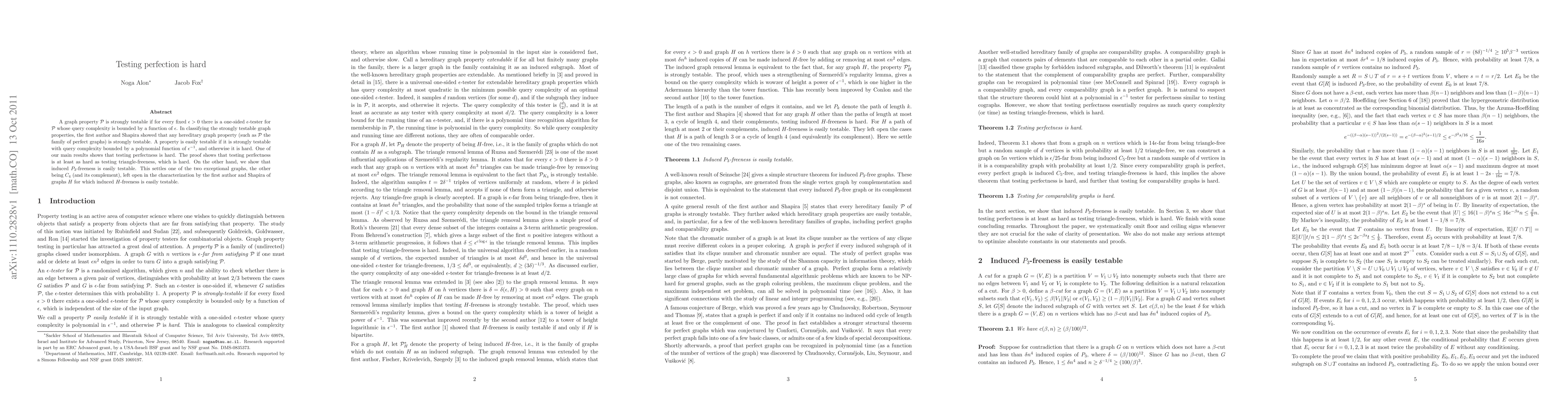 A graph property P is strongly testable if for every fixed \epsilon>0 there is a one-sided \epsilon-tester for P whose query complexity is bounded by a function of \epsilon. In classifying the strongly testable graph properties, the first author and Shapira showed that any hereditary graph property (such as P the family of perfect graphs) is strongly testable. A property is easily testable if it is strongly testable with query complexity bounded by a polynomial function of \epsilon^{-1}, and otherwise it is hard. One of our main results shows that testing perfectness is hard. The proof shows that testing perfectness is at least as hard as testing triangle-freeness, which is hard. On the other hand, we show that induced P_3-freeness is easily testable. This settles one of the two exceptional graphs, the other being C_4 (and its complement), left open in the characterization by the first author and Shapira of graphs H for which induced H-freeness is easily testable.