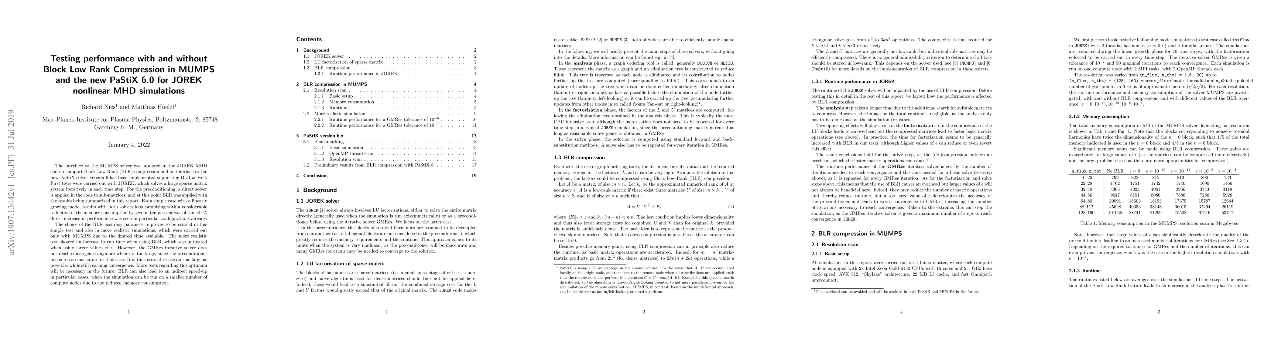 The interface to the MUMPS solver was updated in the JOREK MHD code to support Block Low Rank (BLR) compression and an interface to the new PaStiX solver version 6 has been implemented supporting BLR as well. First tests were carried out with JOREK, which solves a large sparse matrix system iteratively in each time step. For the preconditioning, a direct solver is applied in the code to sub-matrices, and at this point BLR was applied with the results being summarized in this report. For a simple case with a linearly growing mode, results with both solvers look promising with a considerable reduction of the memory consumption by several ten percent was obtained. A direct increase in performance was seen in particular configurations already. The choice of the BLR accuracy parameter $\epsilon$ proves to be critical in this simple test and also in more realistic simulations, which were carried out only with MUMPS due to the limited time available. The more realistic test showed an increase in run time when using BLR, which was mitigated when using larger values of $\epsilon$. However, the GMRes iterative solver does not reach convergence anymore when $\epsilon$ is too large, since the preconditioner becomes too inaccurate in that case. It is thus critical to use an $\epsilon$ as large as possible, while still reaching convergence. More tests regarding this optimum will be necessary in the future. BLR can also lead to an indirect speed-up in particular cases, when the simulation can be run on a smaller number of compute nodes due to the reduced memory consumption.