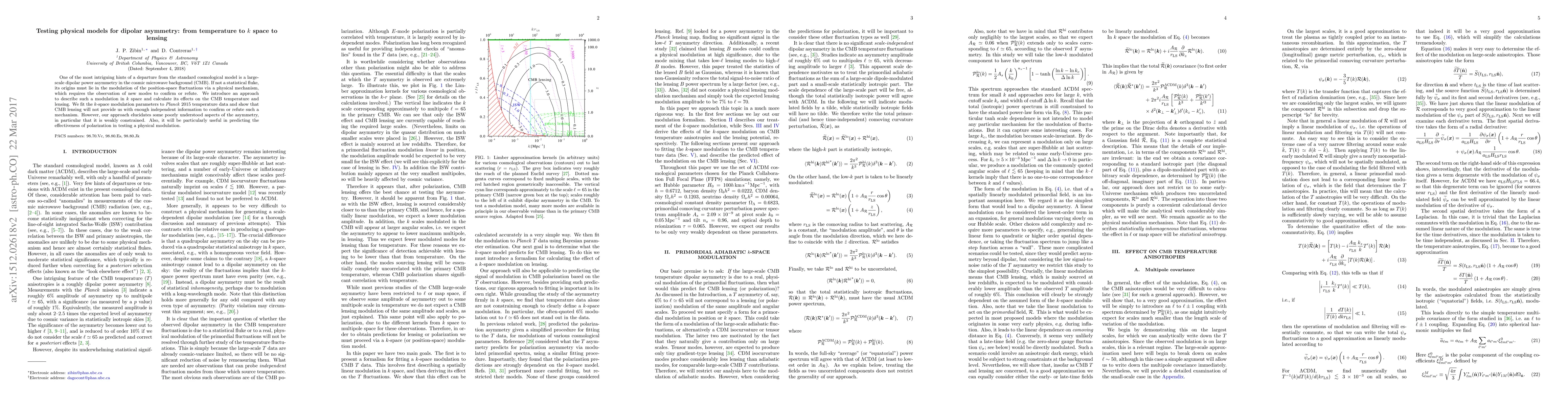 This paper investigates a large-scale dipolar asymmetry in the cosmic microwave background (CMB) and proposes a k-space modulation model to describe its physical origins. The authors fit this model to Planck 2015 temperature data and conclude that CMB lensing lacks sufficient information to confirm or refute the proposed modulation, but it sheds light on the weakly constrained nature of the asymmetry.