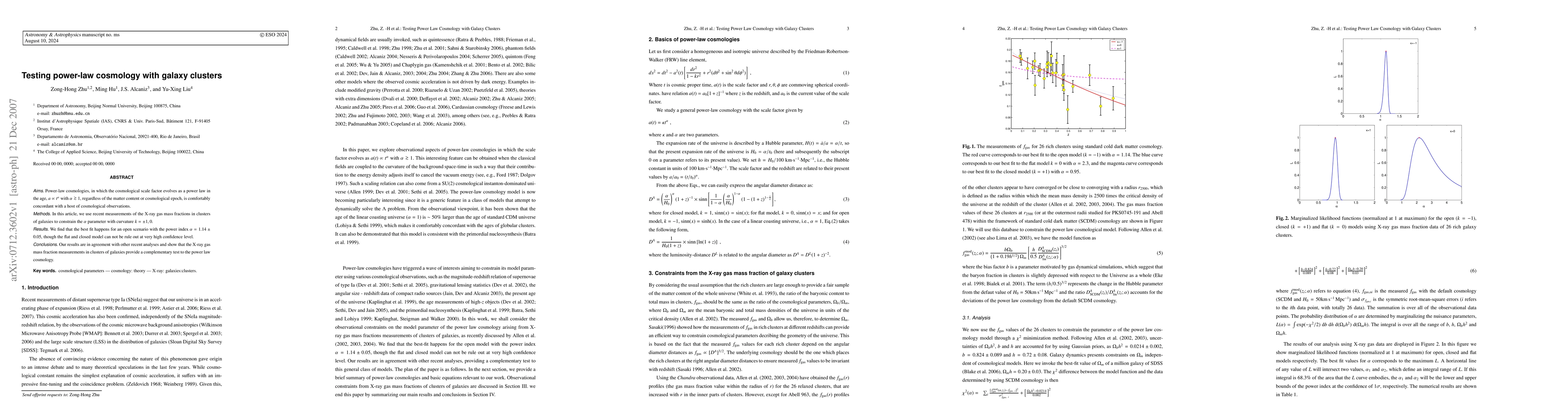 This paper tests power-law cosmology using X-ray gas mass fractions in galaxy clusters, finding an open model with $\alpha = 1.14 \pm 0.05$ best fits the data, while the flat and closed models remain possible at lower confidence levels. The results support power-law cosmology and complement other analyses.