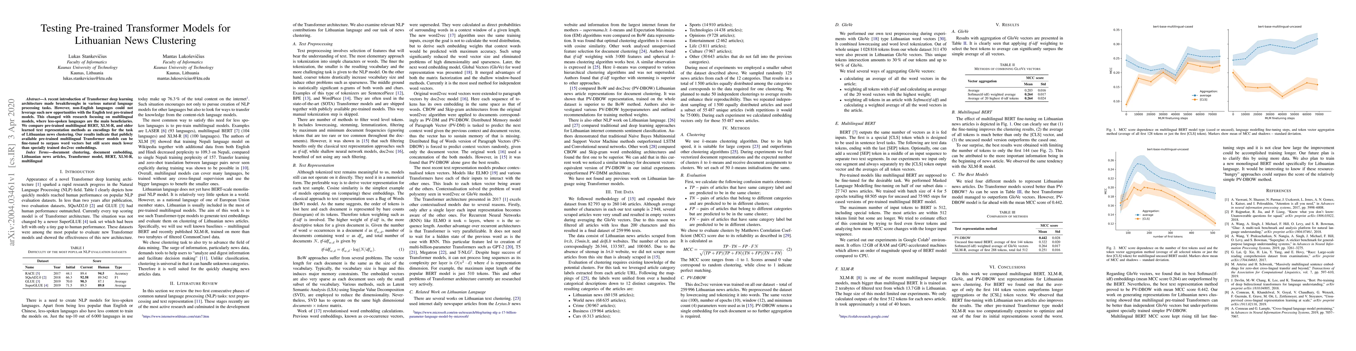 This study evaluates the performance of pre-trained Transformer models like multilingual BERT and XLM-R for Lithuanian news clustering, comparing them against traditional text representation methods. The results show that while these models outperform word vectors, they still lag behind custom-trained doc2vec embeddings.