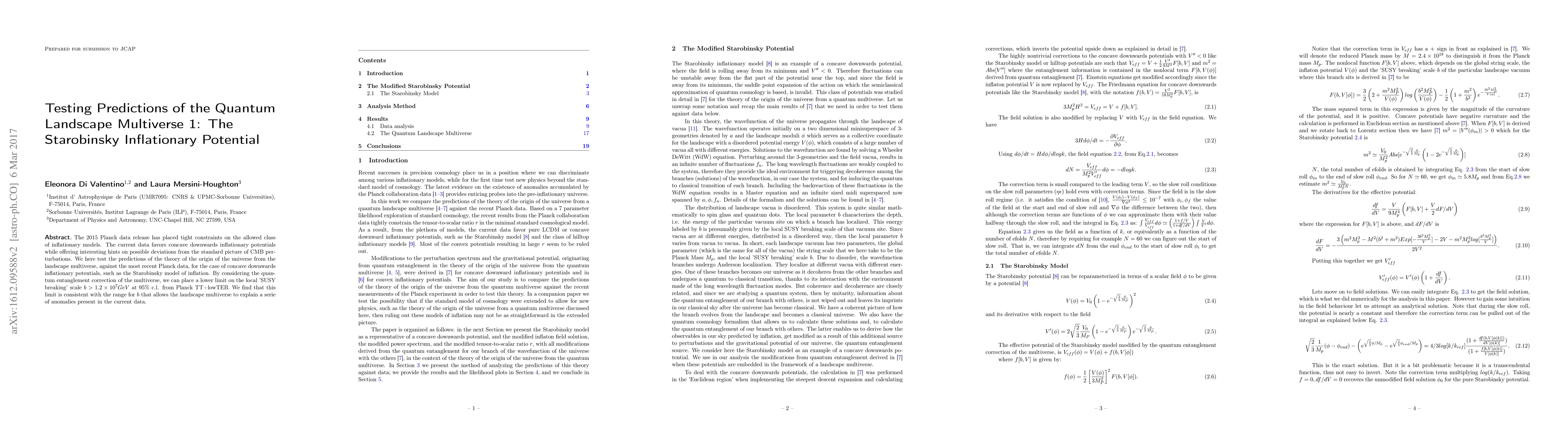 This paper tests predictions of the landscape multiverse theory against recent Planck data for concave downwards inflationary potentials, specifically the Starobinsky model. It finds a lower limit of $b>1.2\times10^7 GeV$ for 'SUSY breaking', consistent with the multiverse's ability to explain anomalies in current data.