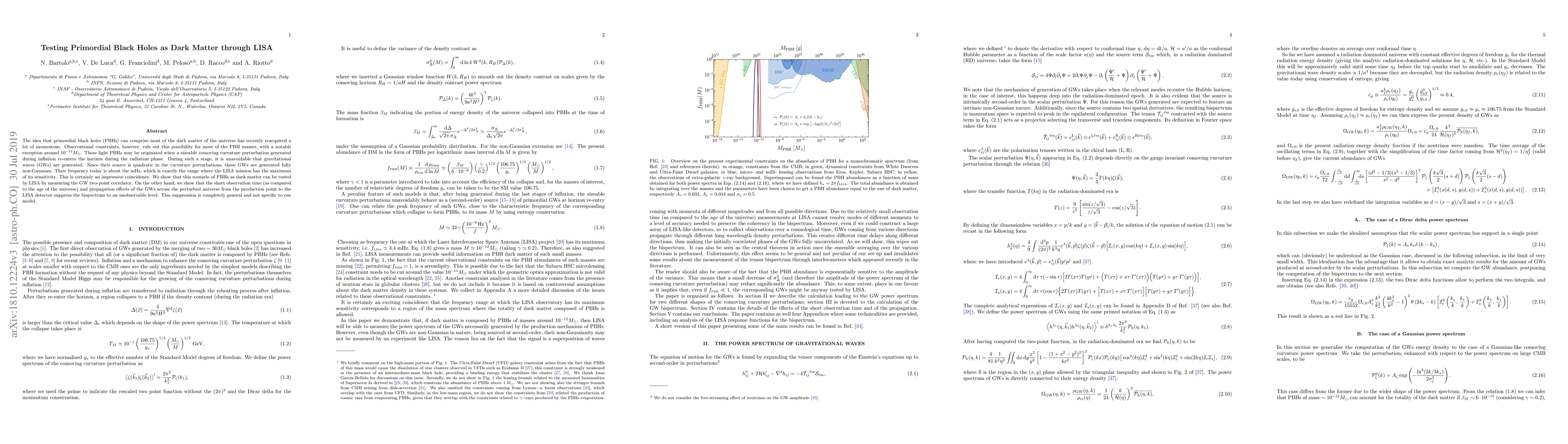 The idea that primordial black holes (PBHs) can comprise most of the dark matter of the universe has recently reacquired a lot of momentum. Observational constraints, however, rule out this possibility for most of the PBH masses, with a notable exception around $10^{-12} M_\odot$. These light PBHs may be originated when a sizeable comoving curvature perturbation generated during inflation re-enters the horizon during the radiation phase. During such a stage, it is unavoidable that gravitational waves (GWs) are generated. Since their source is quadratic in the curvature perturbations, these GWs are generated fully non-Gaussian. Their frequency today is about the mHz, which is exactly the range where the LISA mission has the maximum of its sensitivity. This is certainly an impressive coincidence. We show that this scenario of PBHs as dark matter can be tested by LISA by measuring the GW two-point correlator. On the other hand, we show that the short observation time (as compared to the age of the universe) and propagation effects of the GWs across the perturbed universe from the production point to the LISA detector suppress the bispectrum to an unobservable level. This suppression is completely general and not specific to our model.