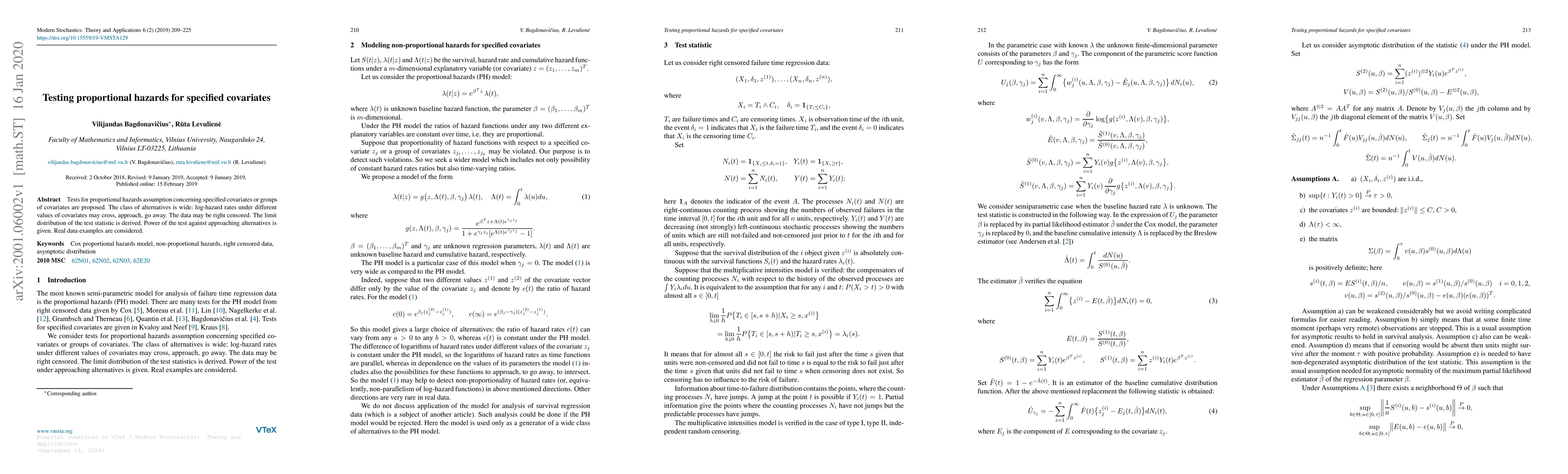 This paper proposes tests for the proportional hazards assumption for specified covariates, allowing for various alternative scenarios where hazard rates may cross, approach, or diverge. It derives the limit distribution of the test statistic and evaluates its power against alternatives, supplemented by real data examples.