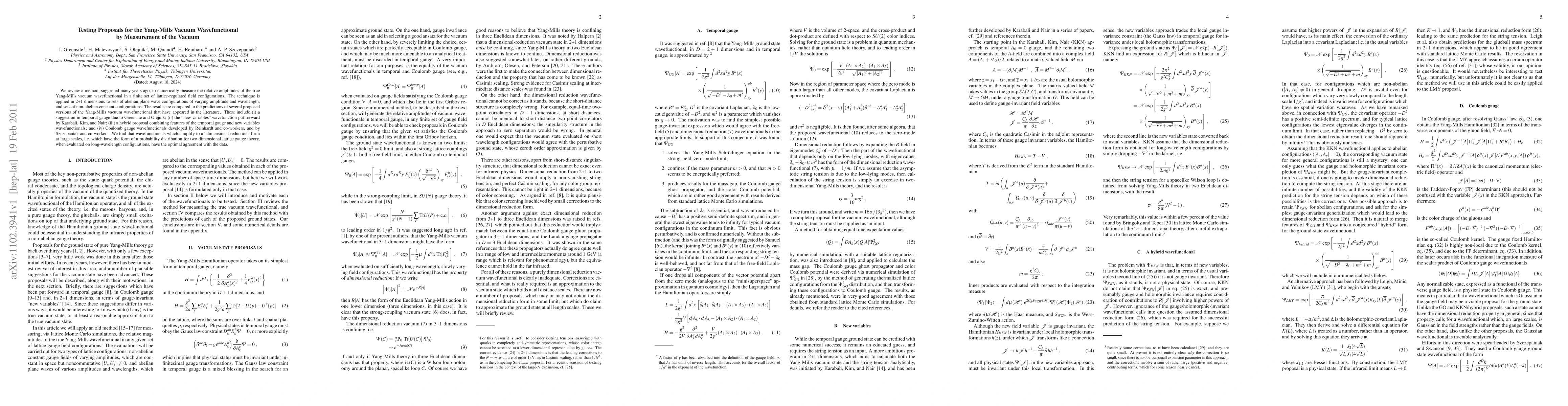 We review a method, suggested many years ago, to numerically measure the relative amplitudes of the true Yang-Mills vacuum wavefunctional in a finite set of lattice-regulated field configurations. The technique is applied in 2+1 dimensions to sets of abelian plane wave configurations of varying amplitude and wavelength, and sets of non-abelian constant configurations. The results are compared to the predictions of several proposed versions of the Yang-Mills vacuum wavefunctional that have appeared in the literature. These include (i) a suggestion in temporal gauge due to Greensite and Olejnik; (ii) the "new variables" wavefunction put forward by Karabali, Kim, and Nair; (iii) a hybrid proposal combining features of the temporal gauge and new variables wavefunctionals; and (iv) Coulomb gauge wavefunctionals developed by Reinhardt and co-workers, and by Szczepaniak and co-workers. We find that wavefunctionals which simplify to a "dimensional reduction" form at large scales, i.e. which have the form of a probability distribution for two-dimensional lattice gauge theory, when evaluated on long-wavelength configurations, have the optimal agreement with the data.