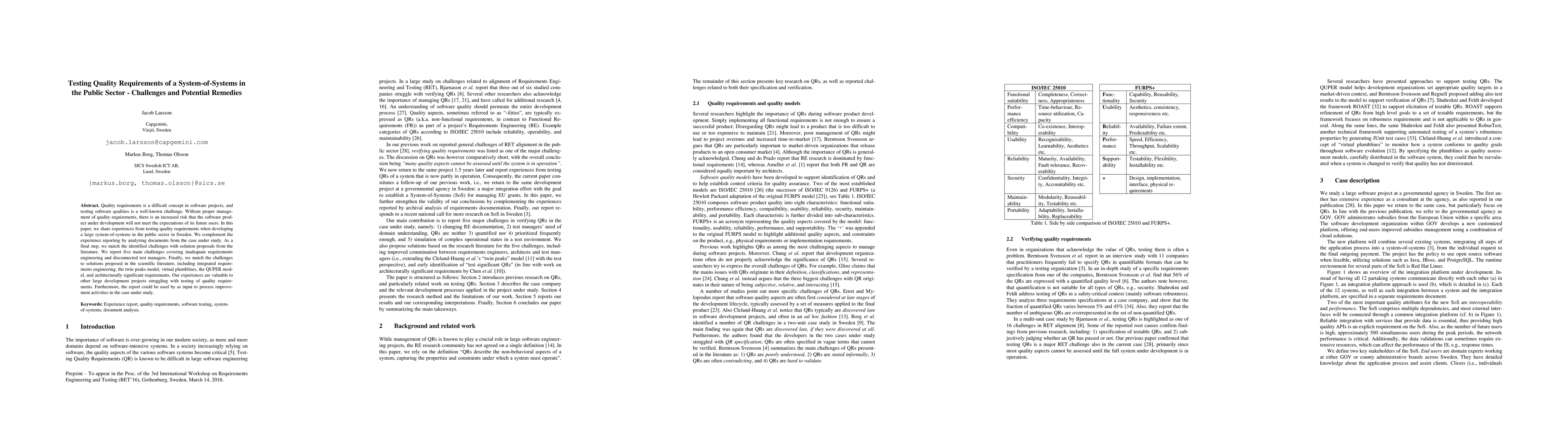 Quality requirements is a difficult concept in software projects, and testing software qualities is a well-known challenge. Without proper management of quality requirements, there is an increased risk that the software product under development will not meet the expectations of its future users. In this paper, we share experiences from testing quality requirements when developing a large system-of-systems in the public sector in Sweden. We complement the experience reporting by analyzing documents from the case under study. As a final step, we match the identified challenges with solution proposals from the literature. We report five main challenges covering inadequate requirements engineering and disconnected test managers. Finally, we match the challenges to solutions proposed in the scientific literature, including integrated requirements engineering, the twin peaks model, virtual plumblines, the QUPER model, and architecturally significant requirements. Our experiences are valuable to other large development projects struggling with testing of quality requirements. Furthermore, the report could be used by as input to process improvement activities in the case under study.