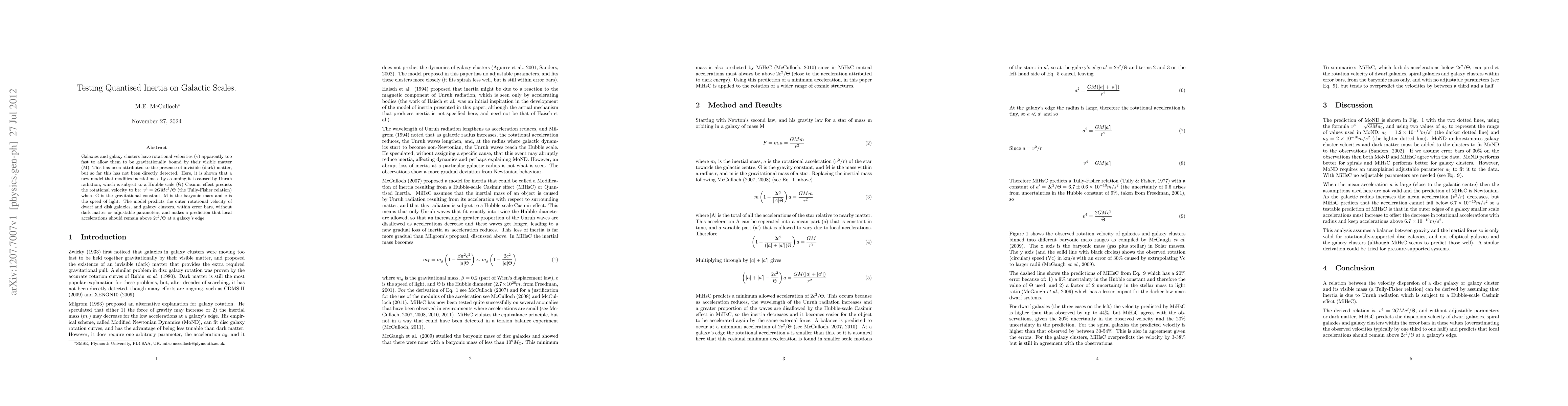 Galaxies and galaxy clusters have rotational velocities apparently too fast to allow them to be gravitationally bound by their visible matter. This has been attributed to the presence of invisible (dark) matter, but so far this has not been directly detected. Here, it is shown that a new model that modifies inertial mass by assuming it is caused by Unruh radiation, which is subject to a Hubble-scale (Theta) Casimir effect predicts the rotational velocity (v) to be: v^4=2GMc^2/Theta (the Tully-Fisher relation) where G is the gravitational constant, M is the baryonic mass and c is the speed of light. The model predicts the outer rotational velocity of dwarf and disk galaxies, and galaxy clusters, within error bars, without dark matter or adjustable parameters, and makes a prediction that local accelerations should remain above 2c^2/Theta at a galaxy's edge.