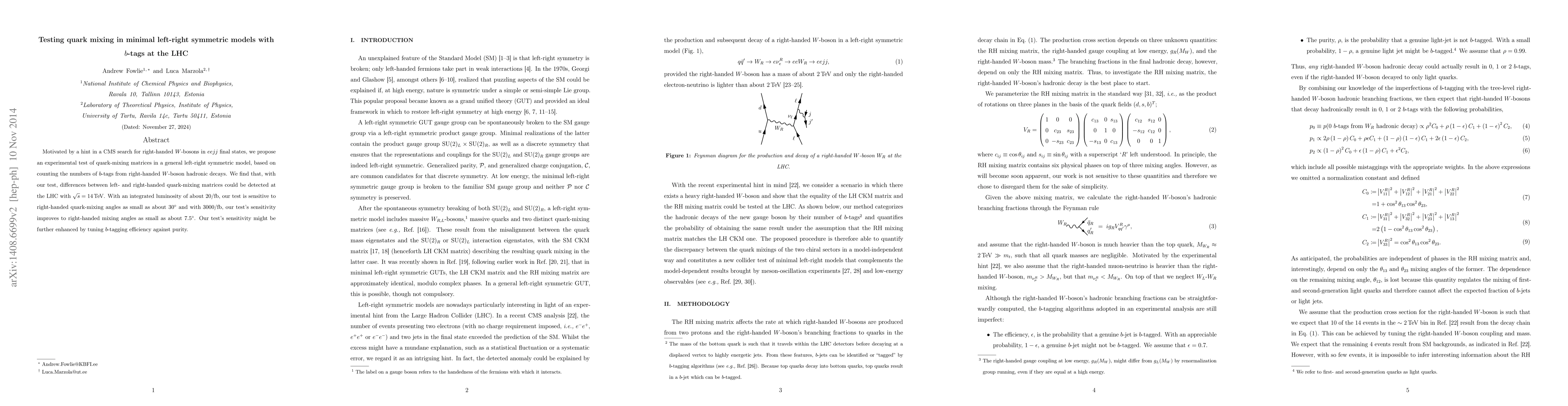 This paper proposes a method to test quark-mixing in minimal left-right symmetric models using $b$-tags at the LHC, finding that differences between left- and right-handed quark-mixing matrices could be detected with sufficient luminosity. The test is sensitive to right-handed mixing angles as small as $30^\circ$ with $20/\textrm{fb}$ of data.