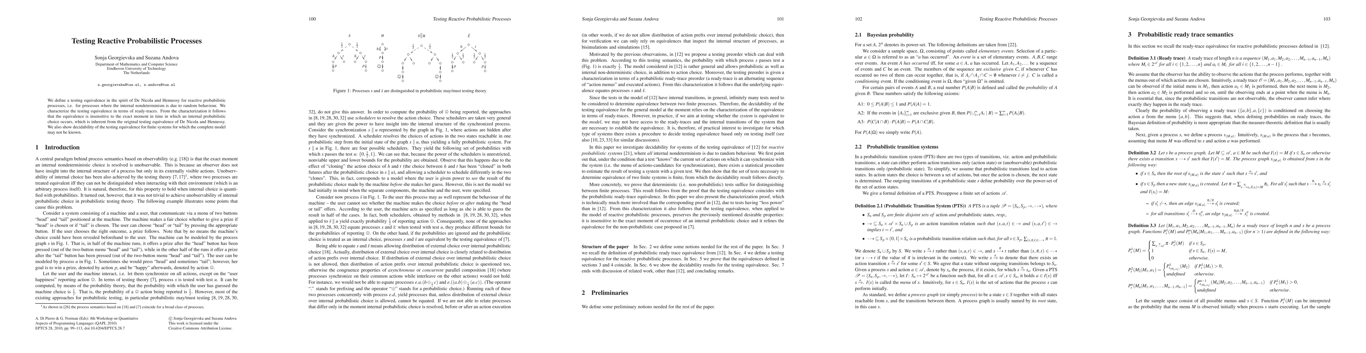 This paper defines a testing equivalence for reactive probabilistic processes, characterized by ready-traces, and demonstrates its insensitivity to internal timing. The authors also prove decidability for finite systems where the complete model may not be fully known.