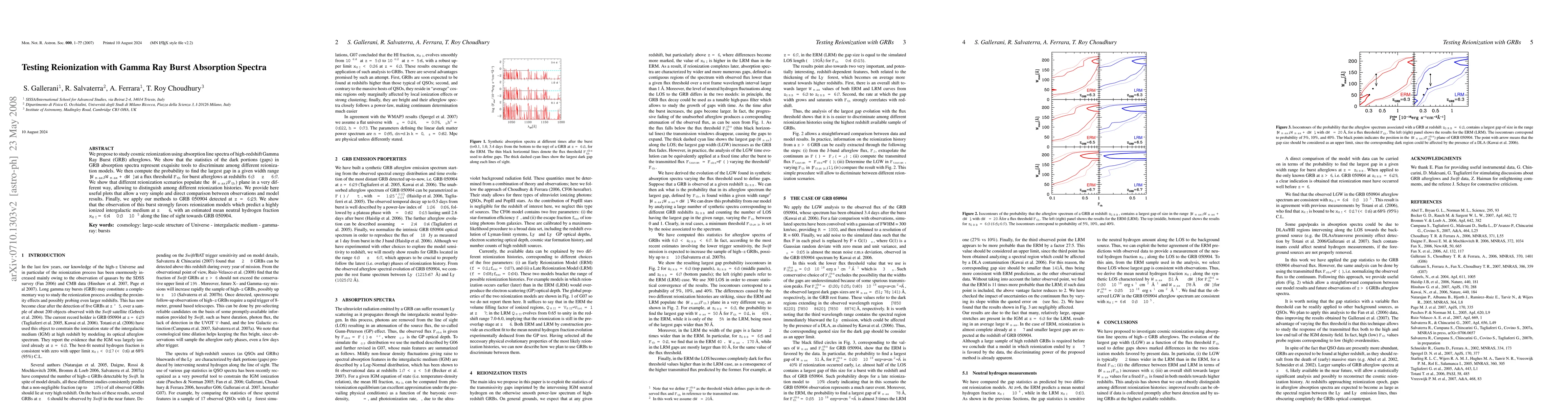 We propose to study cosmic reionization using absorption line spectra of high-redshift Gamma Ray Burst (GRB) afterglows. We show that the statistics of the dark portions (gaps) in GRB absorption spectra represent exquisite tools to discriminate among different reionization models. We then compute the probability to find the largest gap in a given width range [Wmax, Wmax + dW] at a flux threshold Fth for burst afterglows at redshifts 6.3 < z < 6.7. We show that different reionization scenarios populate the (Wmax, Fth) plane in a very different way, allowing to distinguish among different reionization histories. We provide here useful plots that allow a very simple and direct comparison between observations and model results. Finally, we apply our methods to GRB 050904 detected at z = 6.29. We show that the observation of this burst strongly favors reionization models which predict a highly ionized intergalactic medium at z~6, with an estimated mean neutral hydrogen fraction xHI = 6.4 \pm 0.3 \times 10^-5 along the line of sight towards GRB 050904.