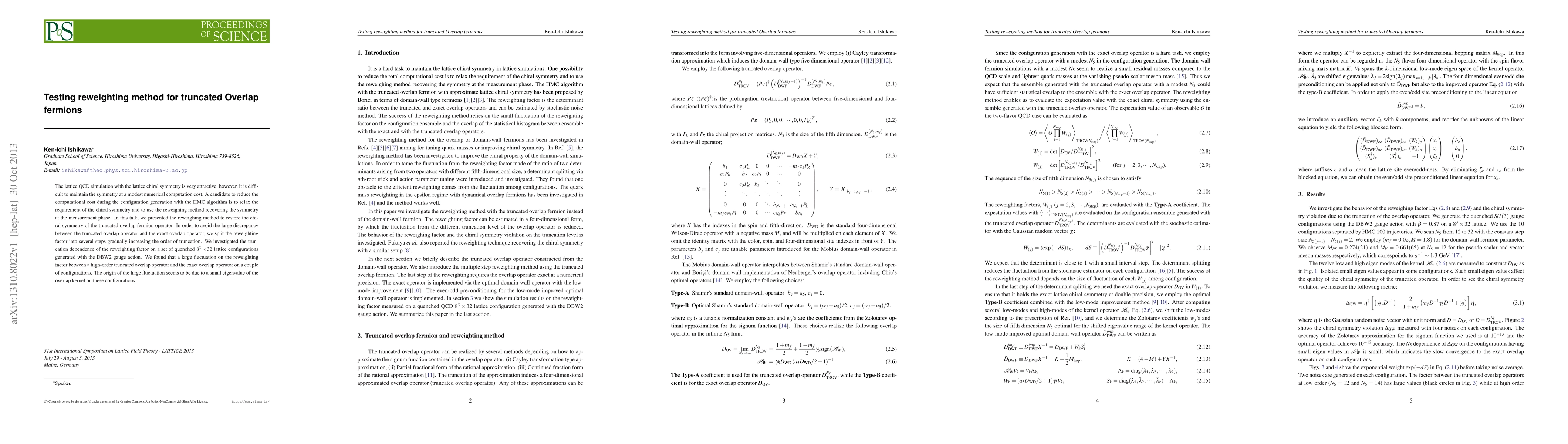 The lattice QCD simulation with the lattice chiral symmetry is very attractive, however, it is difficult to maintain the symmetry at a modest numerical computation cost. A candidate to reduce the computational cost during the configuration generation with the HMC algorithm is to relax the requirement of the chiral symmetry and to use the reweighing method recovering the symmetry at the measurement phase. In this talk, we presented the reweighing method to restore the chiral symmetry of the truncated overlap fermion operator. In order to avoid the large discrepancy between the truncated overlap operator and the exact overlap operator, we split the reweighting factor into several steps gradually increasing the order of truncation. We investigated the truncation dependence of the reweighting factor on a set of quenched $8^3\times 32$ lattice configurations generated with the DBW2 gauge action. We found that a large fluctuation on the reweighting factor between a high-order truncated overlap operator and the exact overlap operator on a couple of configurations. The origin of the large fluctuation seems to be due to a small eigenvalue of the overlap kernel on these configurations.