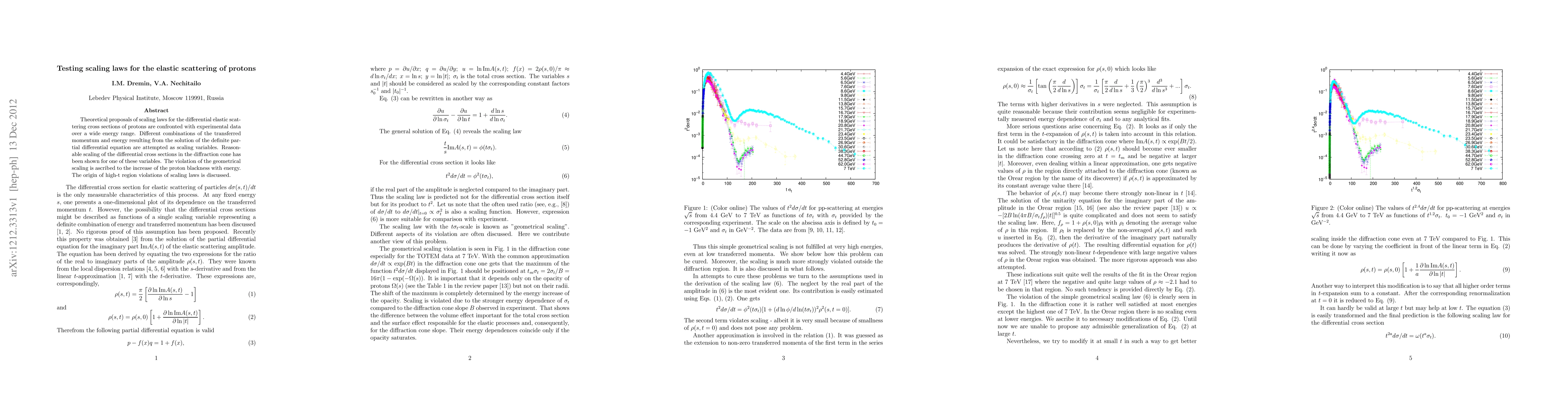 Theoretical proposals of scaling laws for the differential elastic scattering cross sections of protons are confronted with experimental data over a wide energy range. Different combinations of the transferred momentum and energy resulting from the solution of the definite partial differential equation are attempted as scaling variables. Reasonable scaling of the differential cross sections in the diffraction cone has been shown for one of these variables. The violation of the geometrical scaling is ascribed to the increase of the proton blackness with energy. The origin of high-t region violations of scaling laws is discussed.