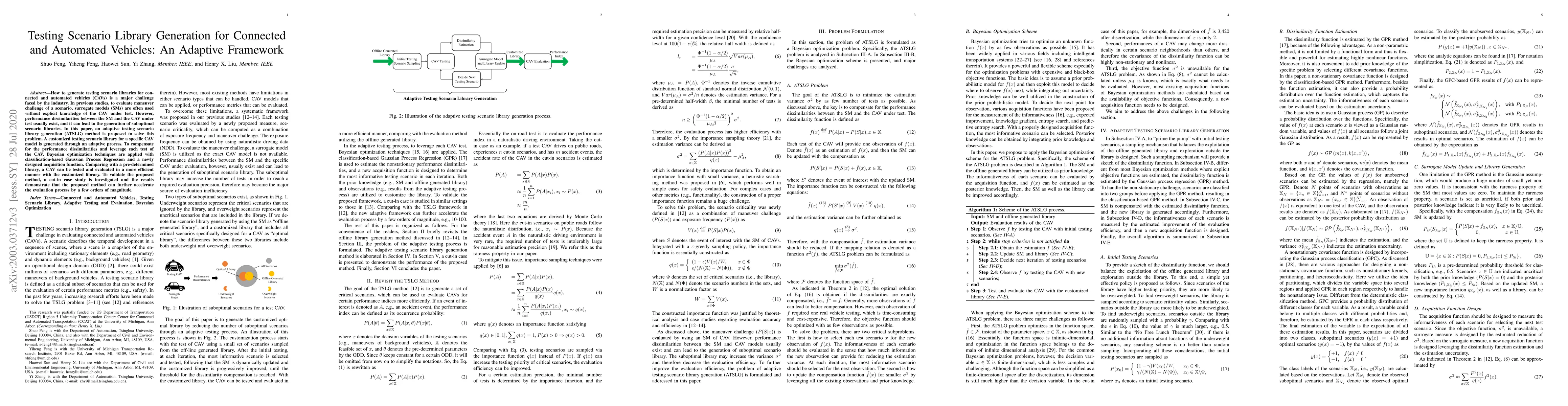This paper proposes an adaptive testing scenario library generation (ATSLG) method to create customized libraries for connected and automated vehicles (CAVs), addressing performance dissimilarities between surrogate models and CAVs. The method uses Bayesian optimization and classification-based Gaussian Process Regression to generate efficient and tailored testing scenarios, significantly accelerating the evaluation process as demonstrated by a cut-in case study.