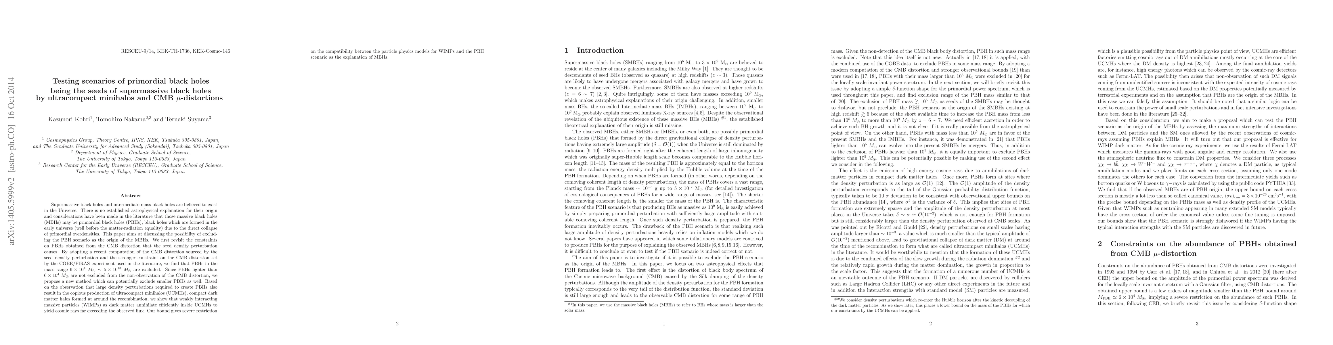 Supermassive black holes and intermediate mass black holes are believed to exist in the Universe. There is no established astrophysical explanation for their origin and considerations have been made in the literature that those massive black holes (MBHs) may be primordial black holes (PBHs), black holes which are formed in the early universe (well before the matter-radiation equality) due to the direct collapse of primordial overdensities. This paper aims at discussing the possibility of excluding the PBH scenario as the origin of the MBHs. We first revisit the constraints on PBHs obtained from the CMB distortion that the seed density perturbation causes. By adopting a recent computation of the CMB distortion sourced by the seed density perturbation and the stronger constraint on the CMB distortion set by the COBE/FIRAS experiment used in the literature, we find that PBHs in the mass range $6\times 10^4~M_\odot \sim 5 \times 10^{13}~M_\odot$ are excluded. Since PBHs lighter than $6 \times 10^4~M_\odot$ are not excluded from the non-observation of the CMB distortion, we propose a new method which can potentially exclude smaller PBHs as well. Based on the observation that large density perturbations required to create PBHs also result in the copious production of ultracompact minihalos (UCMHs), compact dark matter halos formed at around the recombination, we show that weakly interacting massive particles (WIMPs) as dark matter annihilate efficiently inside UCMHs to yield cosmic rays far exceeding the observed flux. Our bound gives severe restriction on the compatibility between the particle physics models for WIMPs and the PBH scenario as the explanation of MBHs.
