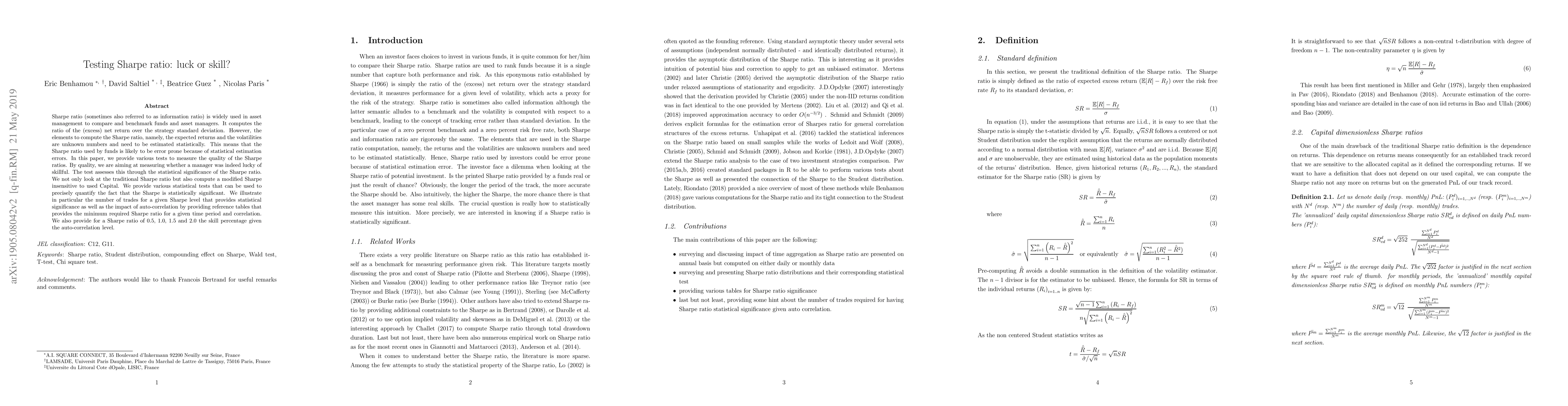 Sharpe ratio (sometimes also referred to as information ratio) is widely used in asset management to compare and benchmark funds and asset managers. It computes the ratio of the (excess) net return over the strategy standard deviation. However, the elements to compute the Sharpe ratio, namely, the expected returns and the volatilities are unknown numbers and need to be estimated statistically. This means that the Sharpe ratio used by funds is likely to be error prone because of statistical estimation errors. In this paper, we provide various tests to measure the quality of the Sharpe ratios. By quality, we are aiming at measuring whether a manager was indeed lucky of skillful. The test assesses this through the statistical significance of the Sharpe ratio. We not only look at the traditional Sharpe ratio but also compute a modified Sharpe insensitive to used Capital. We provide various statistical tests that can be used to precisely quantify the fact that the Sharpe is statistically significant. We illustrate in particular the number of trades for a given Sharpe level that provides statistical significance as well as the impact of auto-correlation by providing reference tables that provides the minimum required Sharpe ratio for a given time period and correlation. We also provide for a Sharpe ratio of 0.5, 1.0, 1.5 and 2.0 the skill percentage given the auto-correlation level.