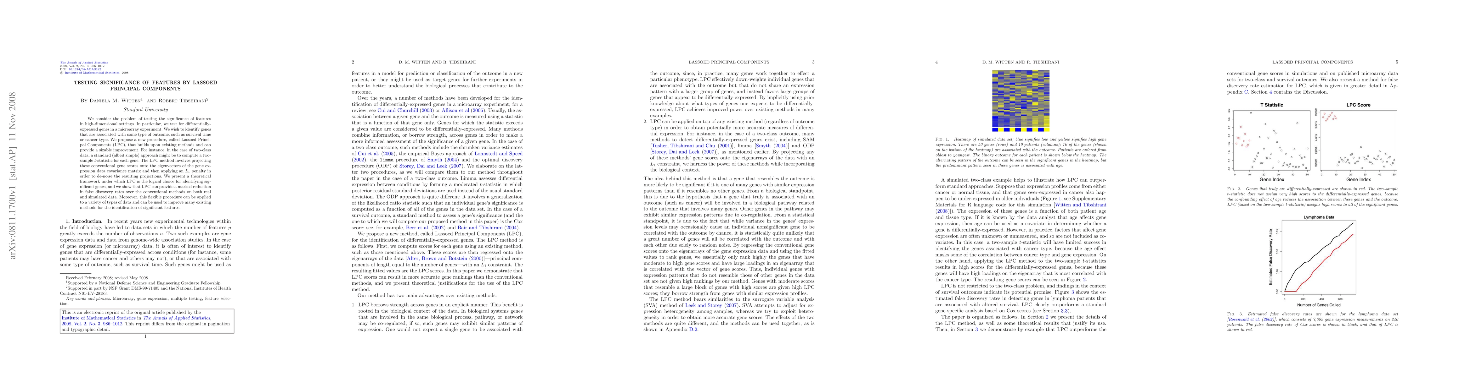 We consider the problem of testing the significance of features in high-dimensional settings. In particular, we test for differentially-expressed genes in a microarray experiment. We wish to identify genes that are associated with some type of outcome, such as survival time or cancer type. We propose a new procedure, called Lassoed Principal Components (LPC), that builds upon existing methods and can provide a sizable improvement. For instance, in the case of two-class data, a standard (albeit simple) approach might be to compute a two-sample $t$-statistic for each gene. The LPC method involves projecting these conventional gene scores onto the eigenvectors of the gene expression data covariance matrix and then applying an $L_1$ penalty in order to de-noise the resulting projections. We present a theoretical framework under which LPC is the logical choice for identifying significant genes, and we show that LPC can provide a marked reduction in false discovery rates over the conventional methods on both real and simulated data. Moreover, this flexible procedure can be applied to a variety of types of data and can be used to improve many existing methods for the identification of significant features.