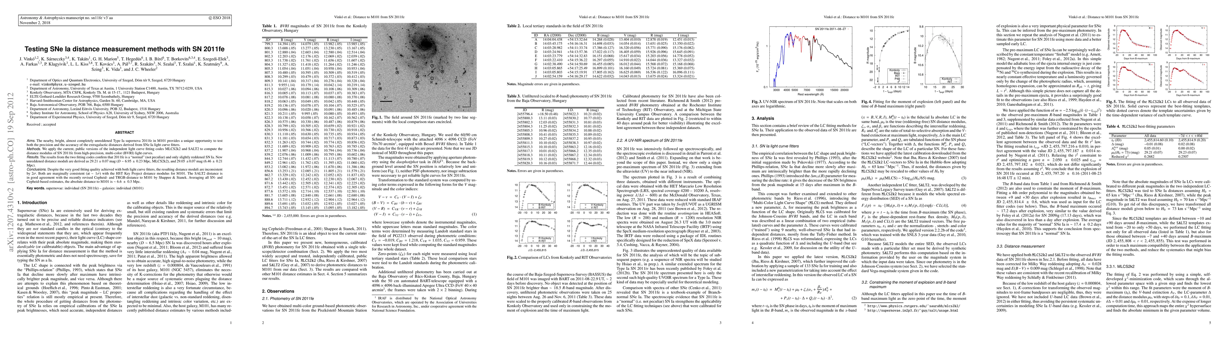 This study tests the precision and accuracy of Type Ia supernova (SNe Ia) distance measurements using SN 2011fe in M101, finding it to be a "normal" SN Ia. Both MLCS2k2 and SALT2 light curve fitters yield slightly different distance moduli, with MLCS2k2 at 29.21 ± 0.07 mag (6.95 ± 0.23 Mpc) and SALT2 at 29.05 ± 0.07 mag (6.46 ± 0.21 Mpc), indicating a 2 sigma inconsistency.