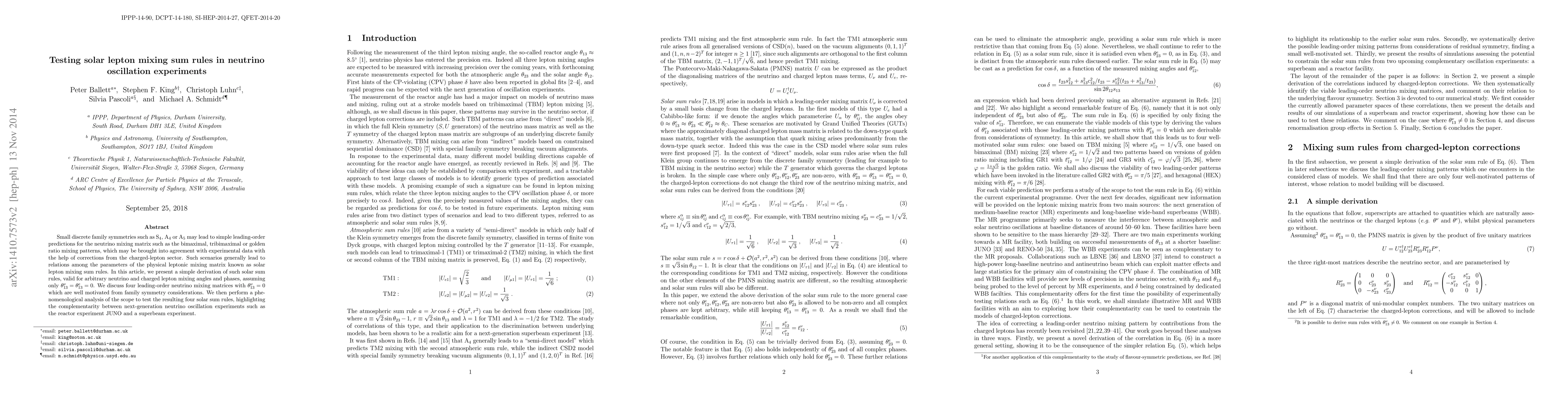 This paper derives solar lepton mixing sum rules from small discrete family symmetries, focusing on four leading-order neutrino mixing matrices. It analyzes the potential for next-generation neutrino oscillation experiments to test these sum rules, emphasizing the complementary roles of JUNO and superbeam experiments.