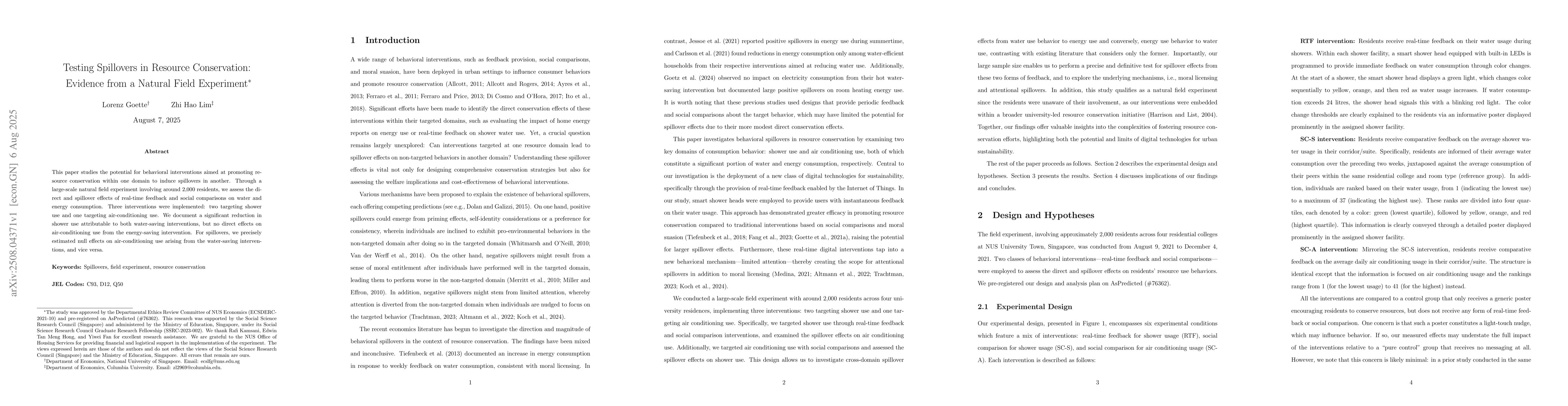 This paper studies the potential for behavioral interventions aimed at promoting resource conservation within one domain to induce spillovers in another. Through a large-scale natural field experiment involving around 2,000 residents, we assess the direct and spillover effects of real-time feedback and social comparisons on water and energy consumption. Three interventions were implemented: two targeting shower use and one targeting air-conditioning use. We document a significant reduction in shower use attributable to both water-saving interventions, but no direct effects on air-conditioning use from the energy-saving intervention. For spillovers, we precisely estimated null effects on air-conditioning use arising from the water-saving interventions, and vice versa.
