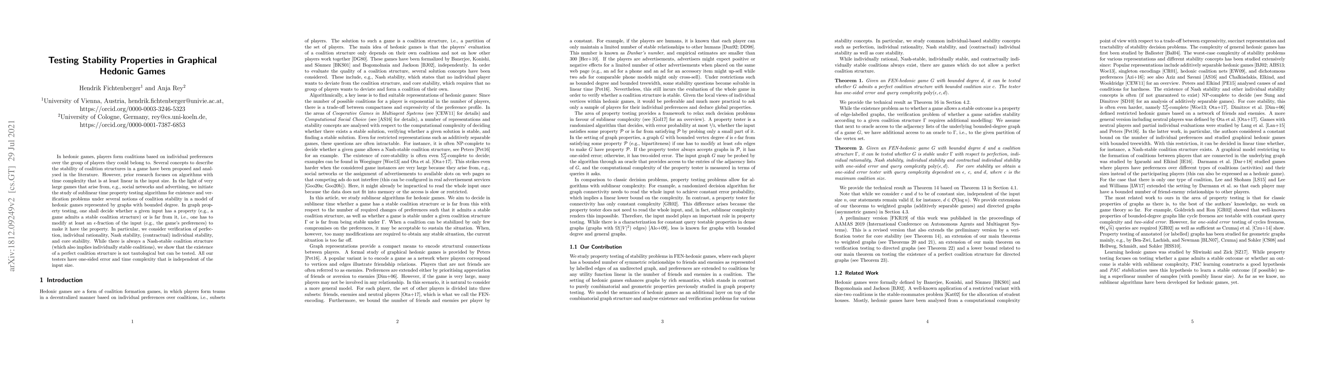 This paper investigates the application of sublinear time complexity algorithms for testing stability properties in large graphical hedonic games, focusing on several notions of coalition stability. The study introduces efficient property testers for verifying perfection, individual rationality, Nash stability, and other forms of stability in hedonic games represented by graphs with bounded degree, with a focus on algorithms that do not depend on the input size.