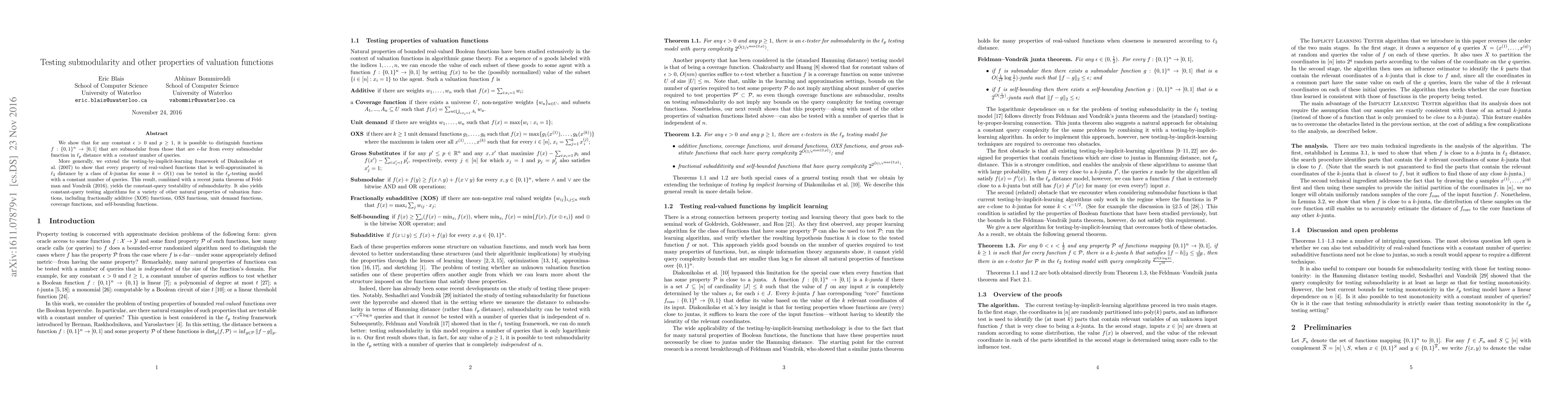 We show that for any constant $\epsilon > 0$ and $p \ge 1$, it is possible to distinguish functions $f : \{0,1\}^n \to [0,1]$ that are submodular from those that are $\epsilon$-far from every submodular function in $\ell_p$ distance with a constant number of queries. More generally, we extend the testing-by-implicit-learning framework of Diakonikolas et al. (2007) to show that every property of real-valued functions that is well-approximated in $\ell_2$ distance by a class of $k$-juntas for some $k = O(1)$ can be tested in the $\ell_p$-testing model with a constant number of queries. This result, combined with a recent junta theorem of Feldman and Vondrak (2016), yields the constant-query testability of submodularity. It also yields constant-query testing algorithms for a variety of other natural properties of valuation functions, including fractionally additive (XOS) functions, OXS functions, unit demand functions, coverage functions, and self-bounding functions.