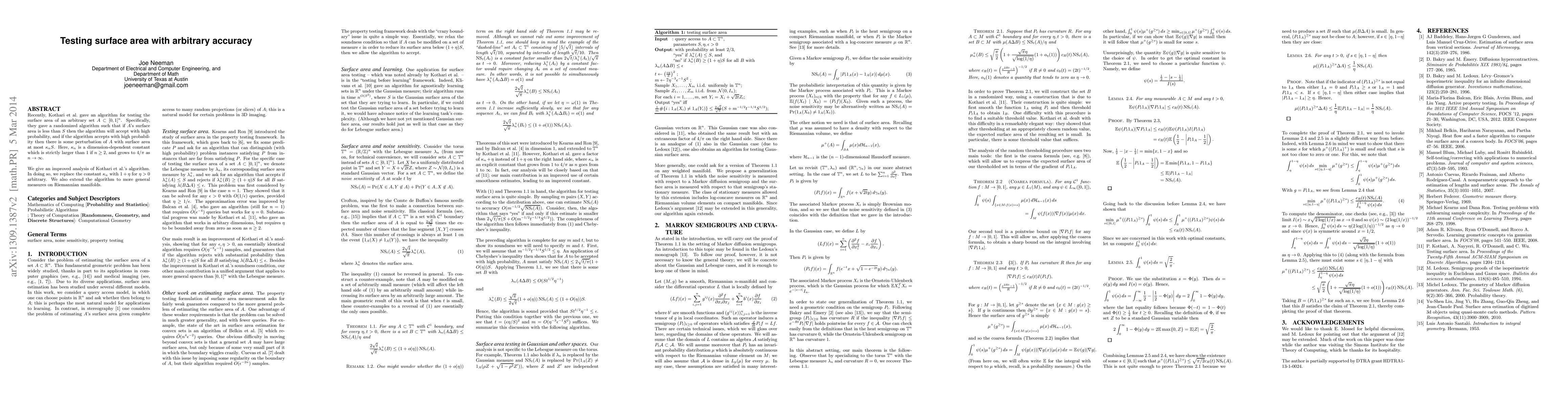 Recently, Kothari et al.\ gave an algorithm for testing the surface area of an arbitrary set $A \subset [0, 1]^n$. Specifically, they gave a randomized algorithm such that if $A$'s surface area is less than $S$ then the algorithm will accept with high probability, and if the algorithm accepts with high probability then there is some perturbation of $A$ with surface area at most $\kappa_n S$. Here, $\kappa_n$ is a dimension-dependent constant which is strictly larger than 1 if $n \ge 2$, and grows to $4/\pi$ as $n \to \infty$. We give an improved analysis of Kothari et al.'s algorithm. In doing so, we replace the constant $\kappa_n$ with $1 + \eta$ for $\eta > 0$ arbitrary. We also extend the algorithm to more general measures on Riemannian manifolds.