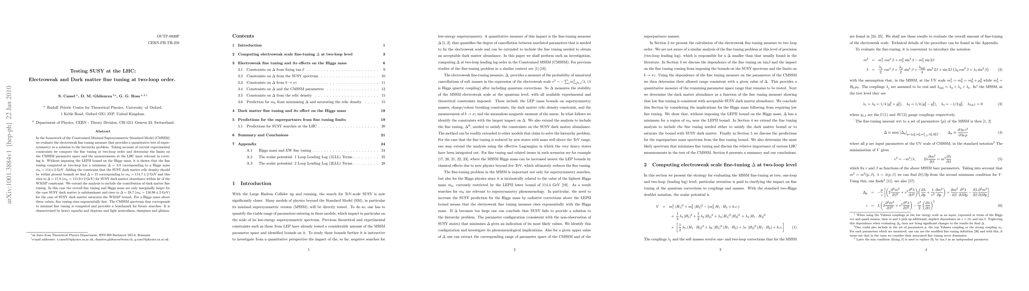 In the framework of the Constrained Minimal Supersymmetric Standard Model (CMSSM) we evaluate the electroweak fine tuning measure that provides a quantitative test of supersymmetry as a solution to the hierarchy problem. Taking account of current experimental constraints we compute the fine tuning at two-loop order and determine the limits on the CMSSM parameter space and the measurements at the LHC most relevant in covering it. Without imposing the LEPII bound on the Higgs mass, it is shown that the fine tuning computed at two-loop has a minimum $\Delta=8.8$ corresponding to a Higgs mass $m_h=114\pm 2$ GeV. Adding the constraint that the SUSY dark matter relic density should be within present bounds we find $\Delta=15$ corresponding to $m_h=114.7\pm 2$ GeV and this rises to $\Delta=17.8$ ($m_h=115.9\pm 2$ GeV) for SUSY dark matter abundance within 3$\sigma$ of the WMAP constraint. We extend the analysis to include the contribution of dark matter fine tuning. In this case the overall fine tuning and Higgs mass are only marginally larger for the case SUSY dark matter is subdominant and rises to $\Delta=28.7$ ($m_h=116.98\pm 2$ GeV) for the case of SUSY dark matter saturates the WMAP bound. For a Higgs mass above these values, fine tuning rises exponentially fast. The CMSSM spectrum that corresponds to minimal fine tuning is computed and provides a benchmark for future searches. It is characterised by heavy squarks and sleptons and light neutralinos, charginos and gluinos.