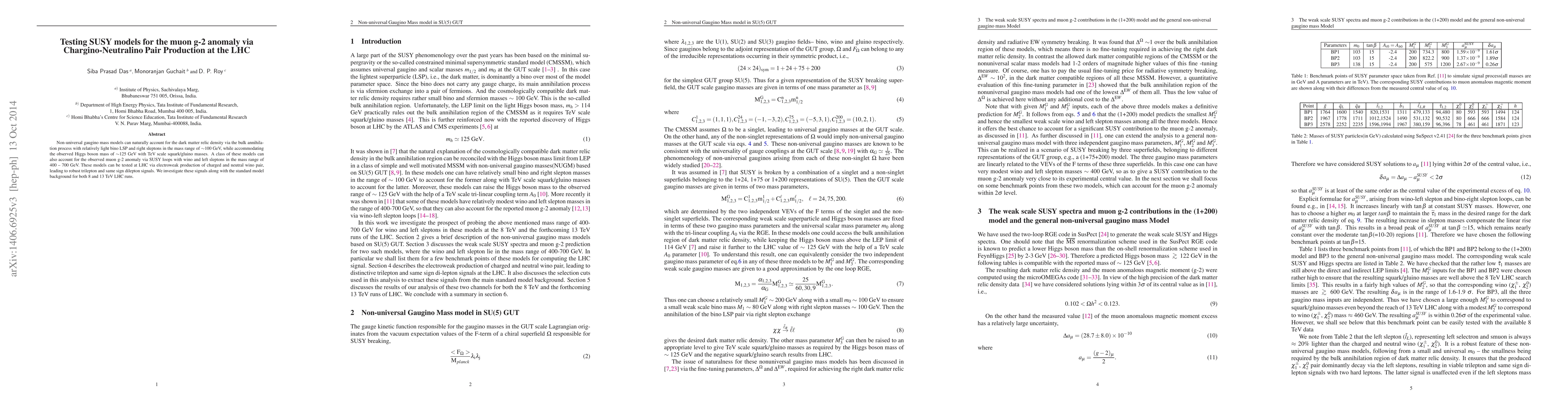 This paper explores how non-universal gaugino mass models can address the muon g-2 anomaly and dark matter through SUSY loops and bino LSP, respectively. It investigates LHC pair production of charginos and neutralinos for these signals, analyzing trilepton and same sign dilepton outcomes at 8 and 13 TeV.