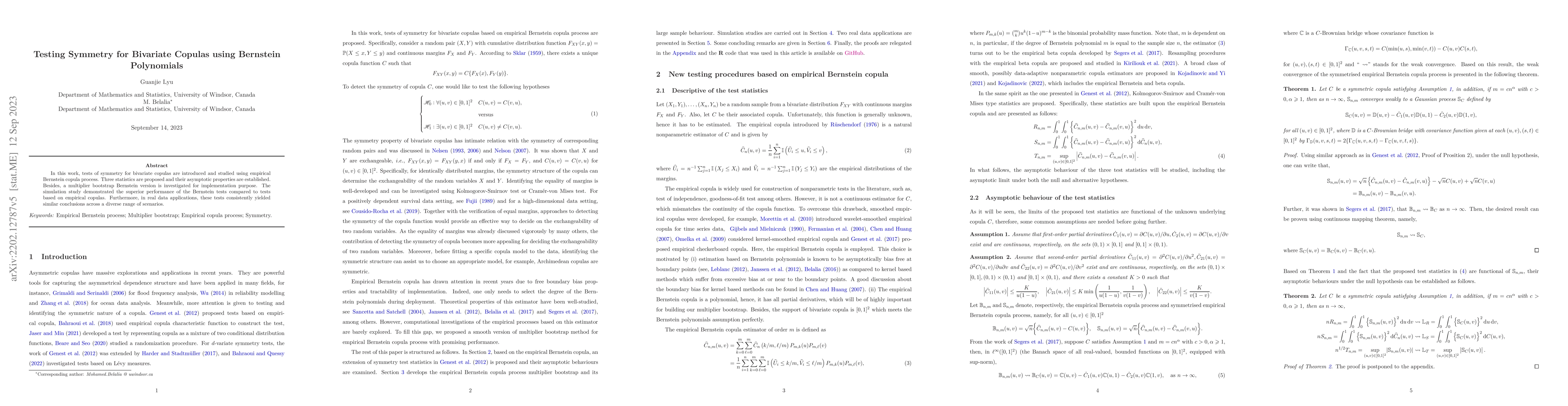 This paper introduces three new symmetry test statistics for bivariate copulas using Bernstein polynomials, establishing their asymptotic properties. A multiplier bootstrap Bernstein version is also proposed, and simulations show superior performance compared to empirical copula-based tests, with consistent results in real data applications.
