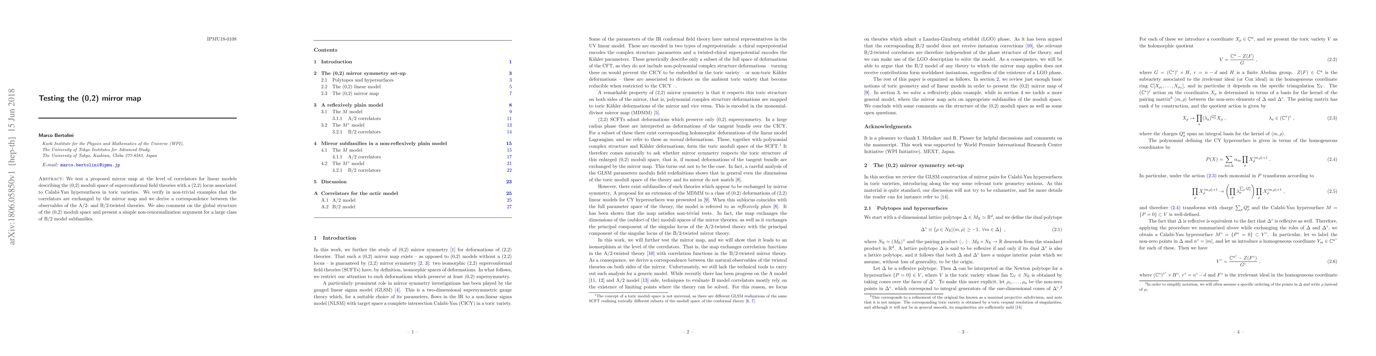 This research tests a proposed mirror map in (0,2) superconformal field theories, confirming its effectiveness in correlator exchanges and deriving a correspondence between A/2- and B/2-twisted observables, while also discussing the global structure of the (0,2) moduli space and providing a non-renormalization argument for B/2 model subfamilies.