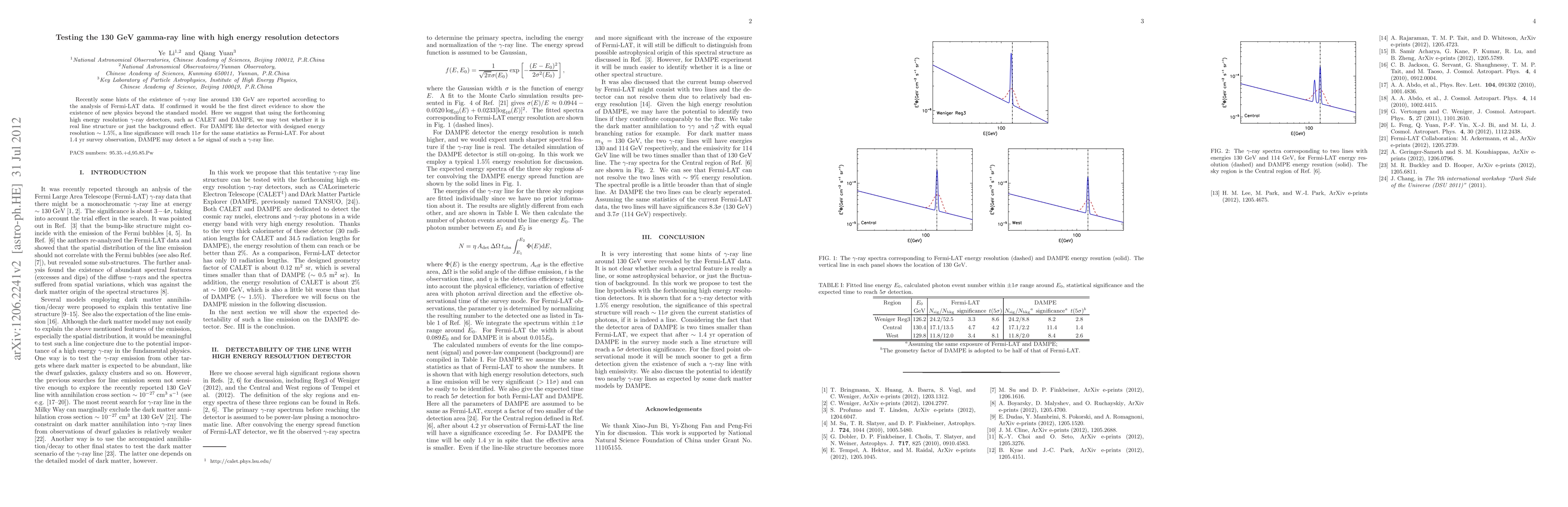 This paper proposes using high energy resolution detectors like CALET and DAMPE to test the reported 130 GeV gamma-ray line, potentially confirming new physics beyond the standard model. With DAMPE's designed energy resolution of 1.5%, a 11σ significance could be achieved for the same data set as Fermi-LAT, and a 5σ signal may be detected within a 1.4-year survey.