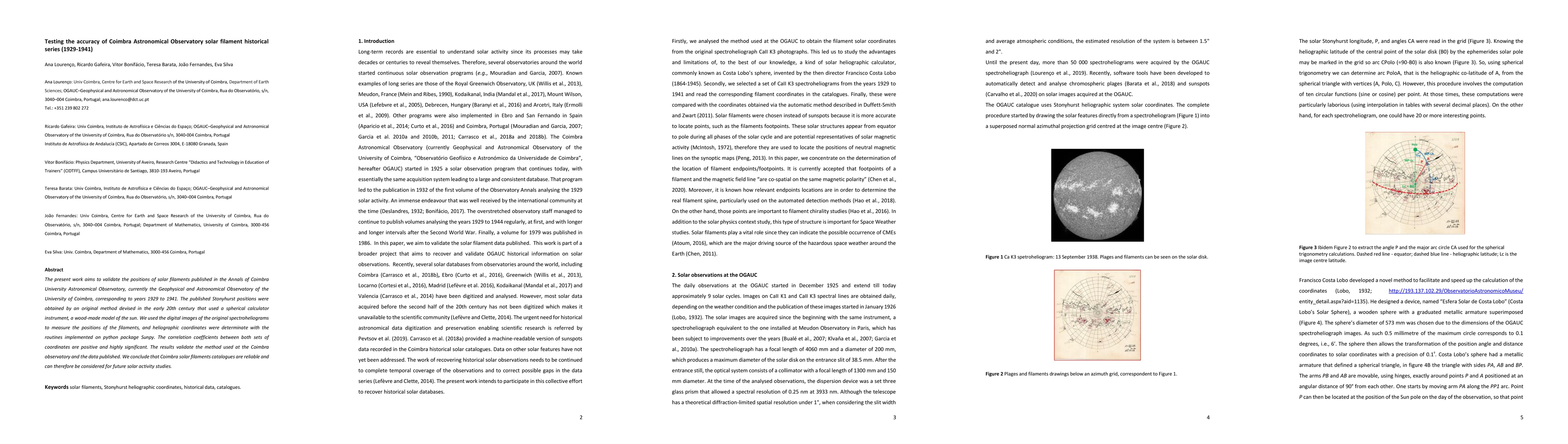 The present work aims to validate the positions of solar filaments published in the Annals of Coimbra University Astronomical Observatory, currently the Geophysical and Astronomical Observatory of the University of Coimbra, corresponding to years 1929 to 1941. The published Stonyhurst positions were obtained by an original method devised in the early 20th century that used a spherical calculator instrument, a wood-made model of the sun. We used the digital images of the original spectroheliograms to measure the positions of the filaments, and heliographic coordinates were determinate with the routines implemented on python package Sunpy. The correlation coefficients between both sets of coordinates are positive and highly significant. The results validate the method used at the Coimbra observatory and the data published. We conclude that Coimbra solar filaments catalogues are reliable and can therefore be considered for future solar activity studies.