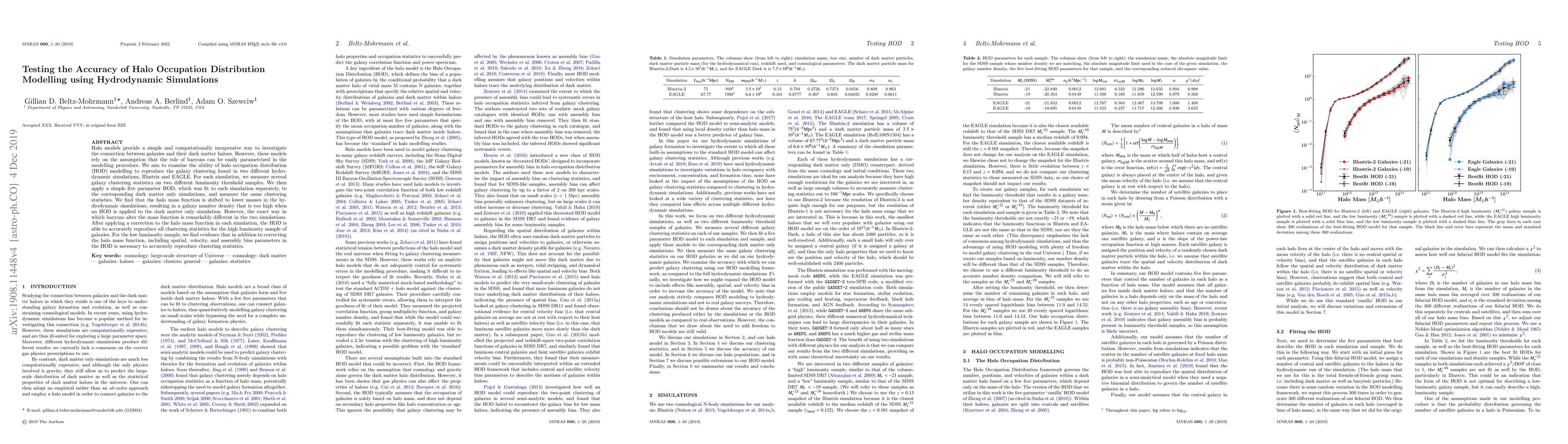 This paper tests the accuracy of halo occupation distribution (HOD) modelling against galaxy clustering in hydrodynamic simulations Illustris and EAGLE. It finds that while HOD can reproduce high luminosity galaxy clustering after correcting the halo mass function, low luminosity clustering requires additional spatial, velocity, and assembly bias parameters.