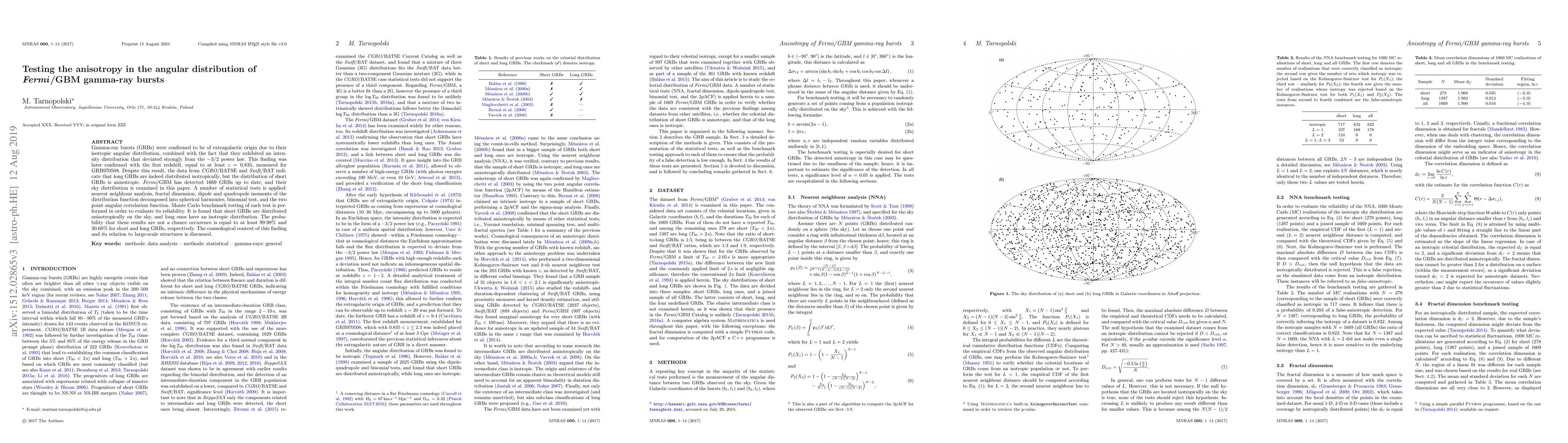 This paper examines the angular distribution of $Fermi$/GBM gamma-ray bursts (GRBs) using various statistical tests, finding that short GRBs are anisotropically distributed while long GRBs are isotropic. The results suggest a 99.98% probability for short GRBs and 30.68% for long GRBs, indicating a possible connection to large-scale cosmic structures.