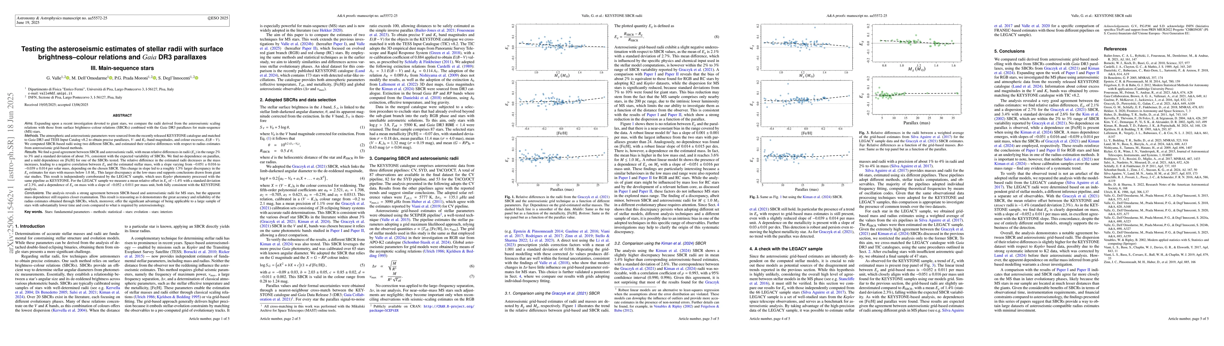 We compare the radii derived from the asteroseismic scaling relations with those from surface brightness-colour relations (SBCRs) combined with the Gaia DR3 parallaxes for main-sequence (MS) stars. The atmospheric and asteroseismic parameters were sourced from the recently released KEYSTONE catalogue and matched to Gaia DR3 and TESS Input Catalog v8.2. We computed SBCR-based radii using two different SBCRs, and estimated their relative differences with respect to radius estimates from asteroseismic grid-based methods. We find a good agreement between SBCR and asteroseismic radii, with mean relative differences in radii ($E_g$) in the range 2% to 3% and a standard deviation of about 3%. We find no dependence on parallax, and a mild dependence on [Fe/H] for one of the SBCRs tested. We find a negative correlation between $E_g$ and the stellar mass, with a slope varying from $-0.051\pm0.016$ to $-0.039\pm0.014$ per solar mass. This change in slope led to a roughly 1.5% larger discrepancy in the $E_g$ estimates for stars with masses below 1.0 $M_{\odot}$. This larger discrepancy at the low-mass end supports conclusions drawn from giant star studies. This result is independently corroborated by the LEGACY sample, which uses Kepler photometry. For the LEGACY sample we measure a mean relative offset in $E_g$ of -1.4% with a standard deviation of 2.3%, and a dependence of $E_g$ on mass with a slope of $-0.052\pm0.011$ per mass unit, both fully consistent with the KEYSTONE analysis. The [...] apparent mass dependence still requires closer examination. This result is reassuring as it demonstrates the great accuracy and reliability of the radius estimates obtained through SBCRs, which, moreover, offer the significant advantage of being applicable to a large sample of stars with substantially lower time and costs compared to what is required by asteroseismology.