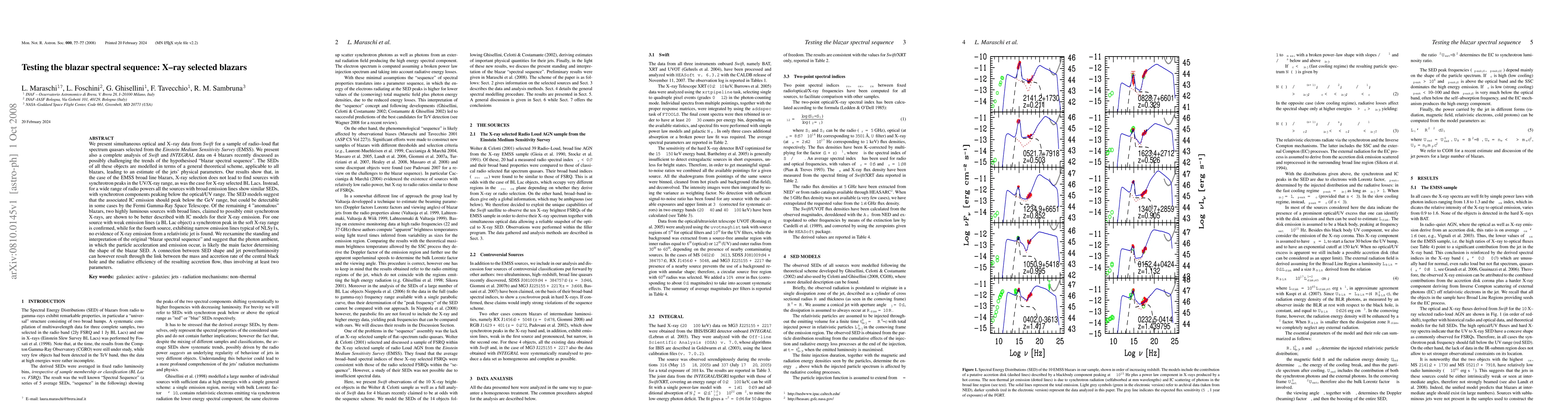We present simultaneous optical and X-ray data from Swift for a sample of FSRQs selected from the EMSS survey. We present also a complete analysis of Swift and INTEGRAL data on 4 blazars recently discussed as possibly challenging the trends of the "blazar spectral sequence". The SEDs of all these objects are modelled in terms of a general theoretical scheme leading to an estimate of the jets' physical parameters. Our results show that, in the case of the EMSS broad line blazars, X-ray selection does not lead to find sources with synchrotron peaks in the UV/X-ray range, as was the case for X-ray selected BL Lacs. Instead, for a wide range of radio powers all the sources with broad emission lines show similar SEDs, with synchrotron components peaking below the optical/UV range. Of the remaining 4 "anomalous" blazars, two highly luminous sources with broad lines, claimed to possibly emit synchrotron X-rays, are shown to be better described with IC models for their X-ray emission. For one source with weak emission lines (a BL Lac object) a synchrotron peak in the soft X-ray range is confirmed, while for the fourth source, exhibiting lines typical of NLSy1s, no evidence of X-ray emission from a relativistic jet is found. We reexamine the original "blazar spectral sequence" and suggest that the photon ambient, in which the particle acceleration and emission occur, is likely the main factor determining the shape of the blazar SED.