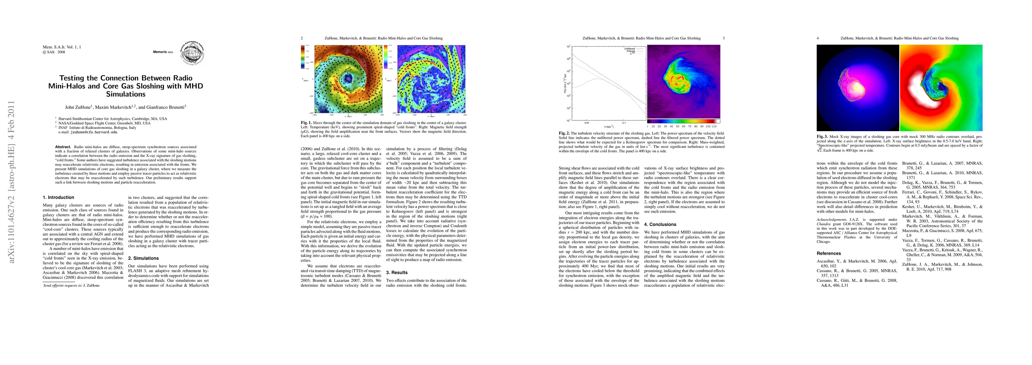 This paper uses MHD simulations to explore the connection between radio mini-halos and core gas sloshing in galaxy clusters, suggesting that turbulence from sloshing motions may reaccelerate relativistic electrons, supporting the observed correlation between radio emissions and X-ray signatures of gas sloshing. Preliminary results indicate a potential link between sloshing motions and particle reacceleration.