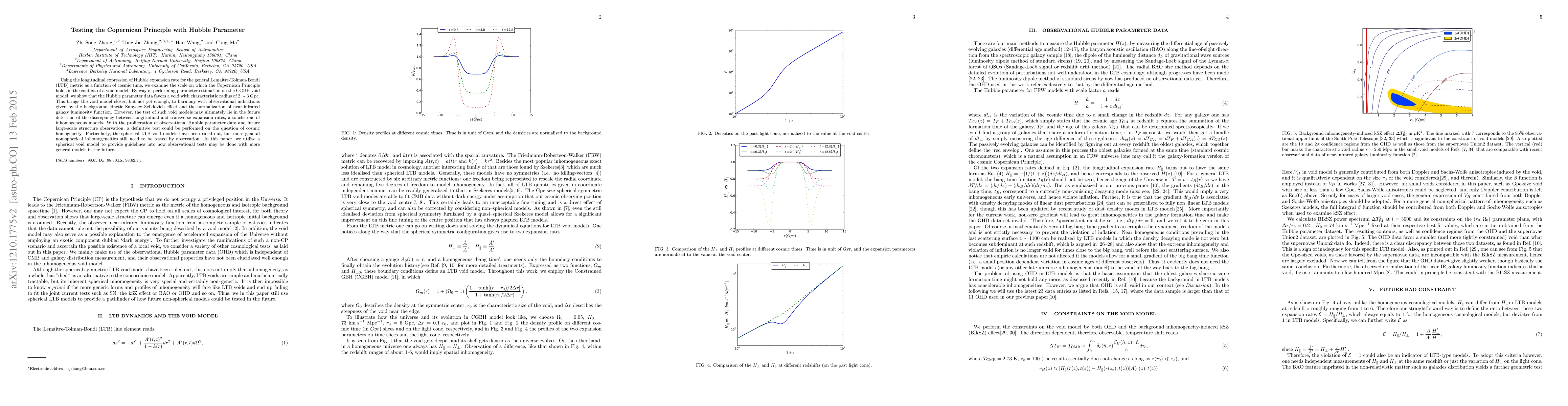 This paper tests the Copernican Principle using Hubble parameter data within a spherical void model of the LTB metric, finding a void radius of 2-3 Gpc. While this model aligns somewhat with observational data, it suggests that future detection of discrepancies in expansion rates and more comprehensive large-scale structure observations could definitively test cosmic homogeneity.