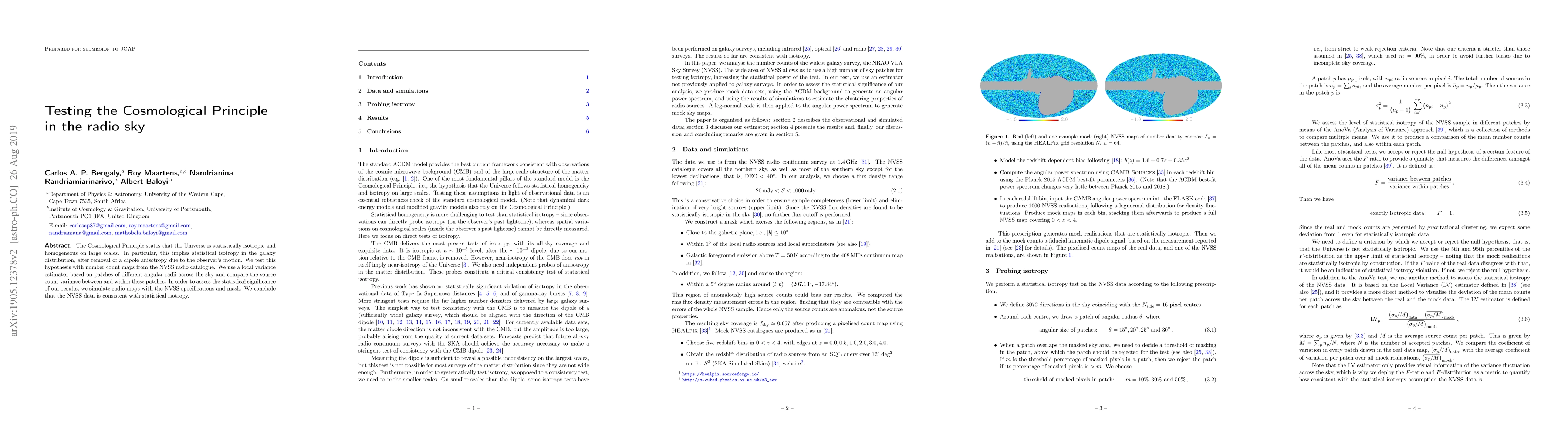 This paper tests the Cosmological Principle using NVSS radio catalogue data, finding no significant deviations from statistical isotropy in the galaxy distribution after accounting for the observer's motion. Simulations confirm the results' statistical significance.