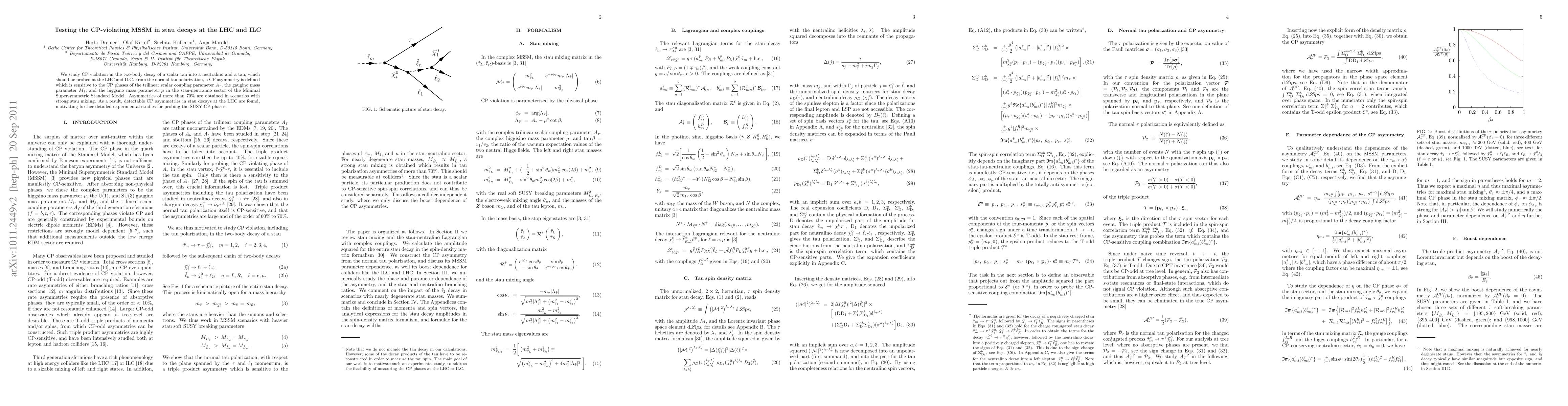 This paper investigates CP violation in stau decays within the Minimal Supersymmetric Standard Model, focusing on two-body decays into a neutralino and a tau. Detectable CP asymmetries exceeding 70% are predicted in scenarios with significant stau mixing, highlighting the potential for probing SUSY CP phases at the LHC and ILC.