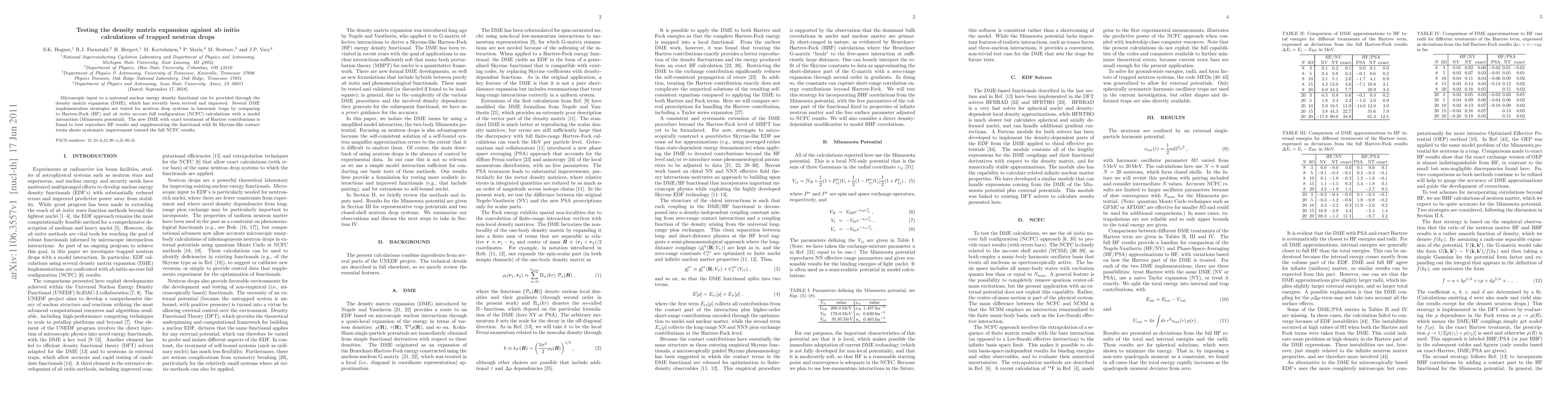 The paper tests various density matrix expansion (DME) implementations against ab initio calculations for neutron drop systems in harmonic traps, finding that the new DME with exact Hartree treatment and supplemented Skyrme-like terms best matches both Hartree-Fock and no-core full configuration results.