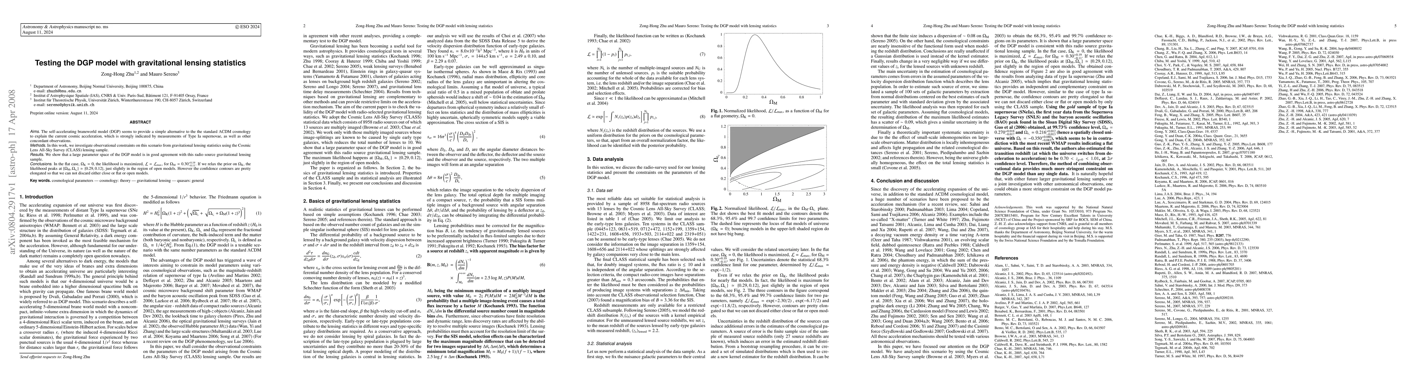 This paper tests the DGP braneworld model against gravitational lensing data from the CLASS survey, finding that a large parameter space of the model is consistent with the lensing statistics. The likelihood is maximized for a flat model with $\1 = 0.30$, but relaxed priors allow for open models, though the confidence contours are elongated, indicating uncertainty in the model's geometry.