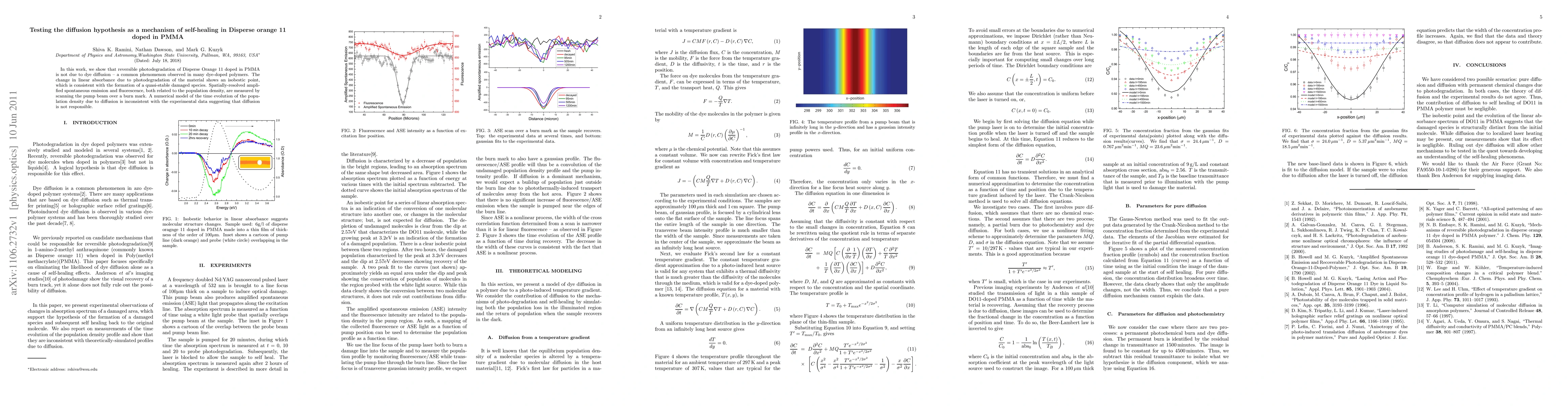 This study demonstrates that the reversible photodegradation of Disperse Orange 11 in PMMA does not involve dye diffusion, as evidenced by an isobestic point and inconsistent numerical models. Instead, it suggests a quasi-stable damaged species formation.