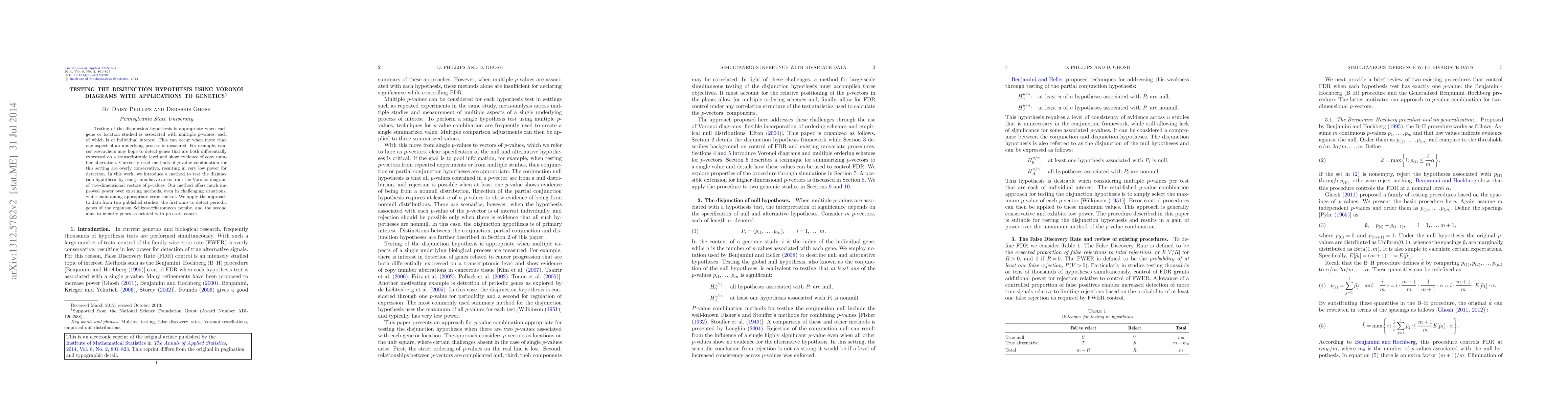 This paper proposes a novel method using Voronoi diagrams to test the disjunction hypothesis in genetics, offering improved power over existing $p$-value combination methods while maintaining error control. The method is applied to detect periodic genes in Schizosaccharomyces pombe and genes associated with prostate cancer.