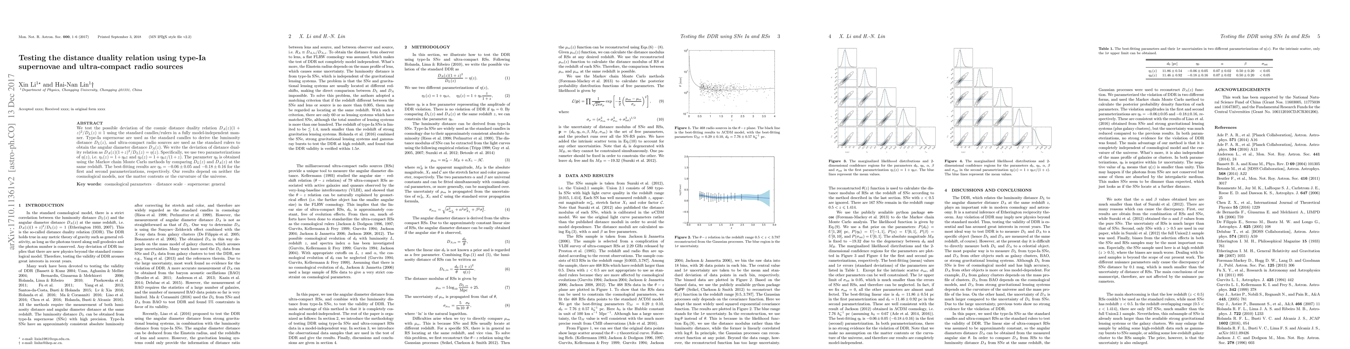 The research methodology involves testing the distance duality relation (DDR) using Type Ia supernovae (SNe) as luminosity distance indicators and ultracompact radio sources (RSs) as angular diameter distance indicators. The DDR violation is parameterized as DA(z)(1+z)^2/DL(z) = η(z), with η(z) parameterized as η1(z) = 1 + η0z or η2(z) = 1 + η0z/(1+z). Markov chain Monte Carlo methods are used to constrain the free parameters, including η0, d0, α, β, and σint.