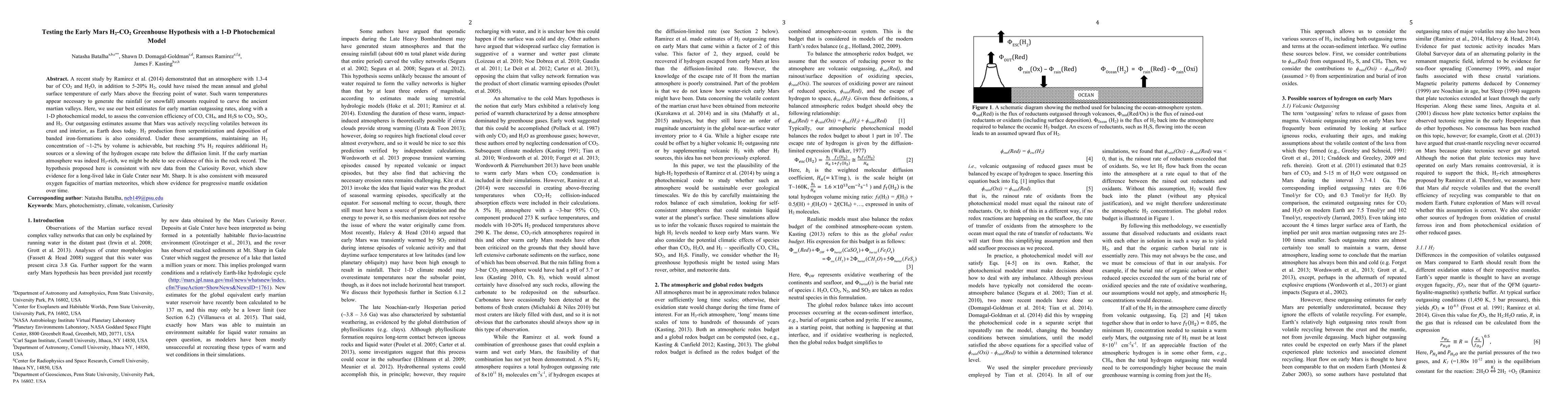 This study tests the hypothesis that an early Martian atmosphere rich in H2 and CO2 could have warmed Mars enough to support liquid water, using a 1-D photochemical model. The findings suggest that while an H2 concentration of ~1-2% is achievable, reaching 5% H2 would require additional sources or reduced hydrogen escape, supporting the possibility of a warmer early Mars.