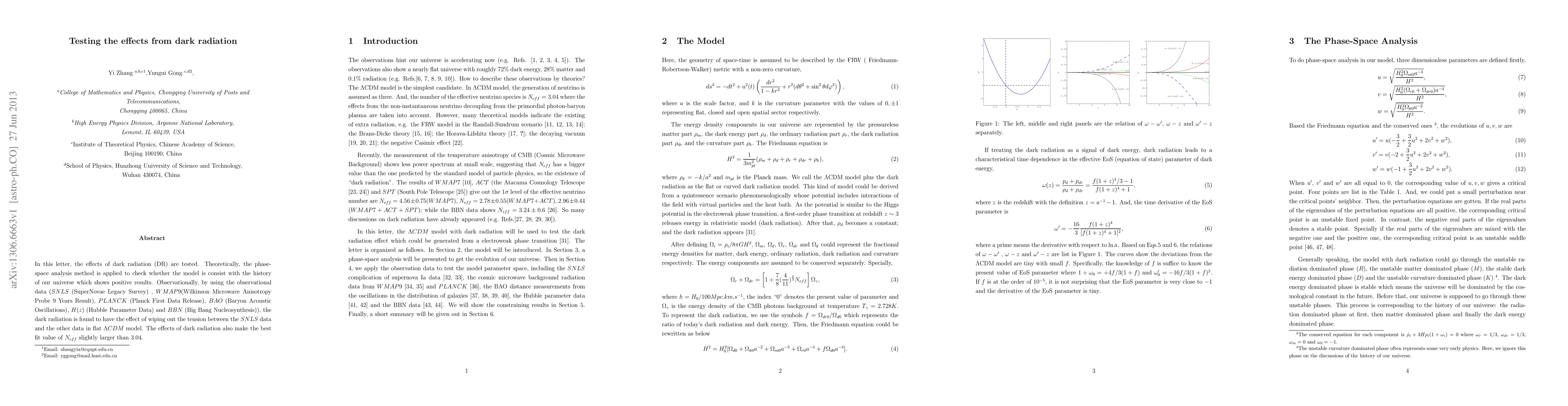This research tests dark radiation's impact on cosmic evolution using phase-space analysis, finding it resolves tension in the Lambda CDM model and slightly increases Neff beyond its base value of 3.04, based on SNLS, WMAP9, PLANCK, BAO, H(z), and BBN data.