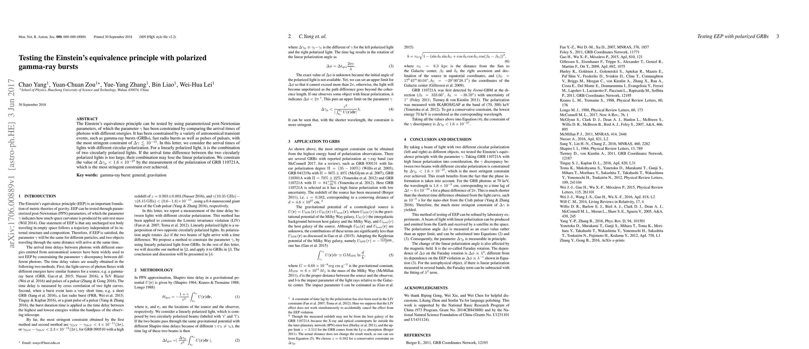 This paper tests the Einstein's equivalence principle by analyzing the arrival times of circularly polarized photons from gamma-ray bursts, achieving a new constraint on $\Delta \gamma_{\rm p} < 1.6 \times 10^{-27}$ using GRB 110721A. This is the most stringent constraint to date.