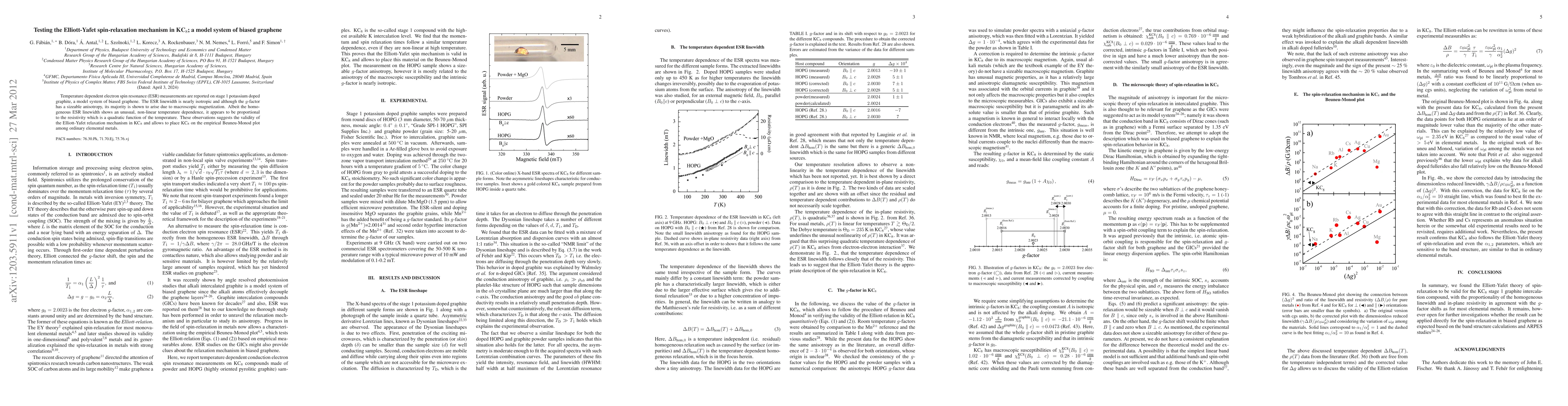 Research on KC8, a model system of biased graphene, supports the Elliott-Yafet spin-relaxation mechanism via temperature-dependent ESR measurements, suggesting a non-linear temperature dependence proportional to resistivity.