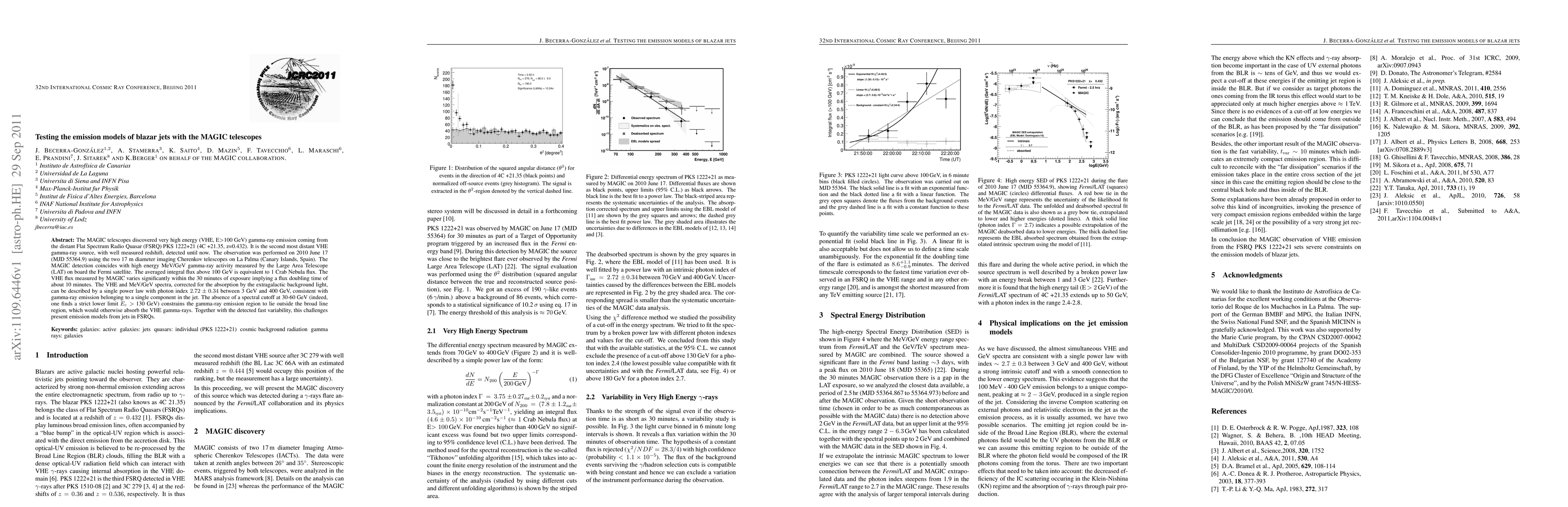The MAGIC telescopes detected very high energy gamma-ray emissions from the distant FSRQ PKS 1222+21, revealing significant variability and a power-law spectrum extending beyond 130 GeV. This challenges current emission models for blazar jets, suggesting the emission region lies outside the broad line region.